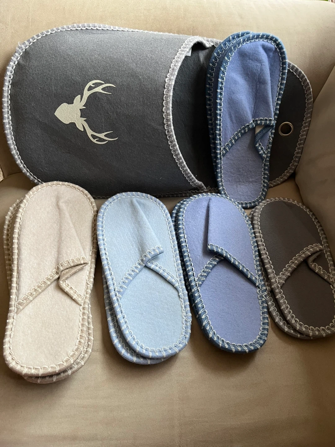 The set includes slippers in beige, light blue, blue, and grey. The carrying case features a cute deer design. Great for when guests come. They are all new except for the one pair standing up. That pair is still like new.