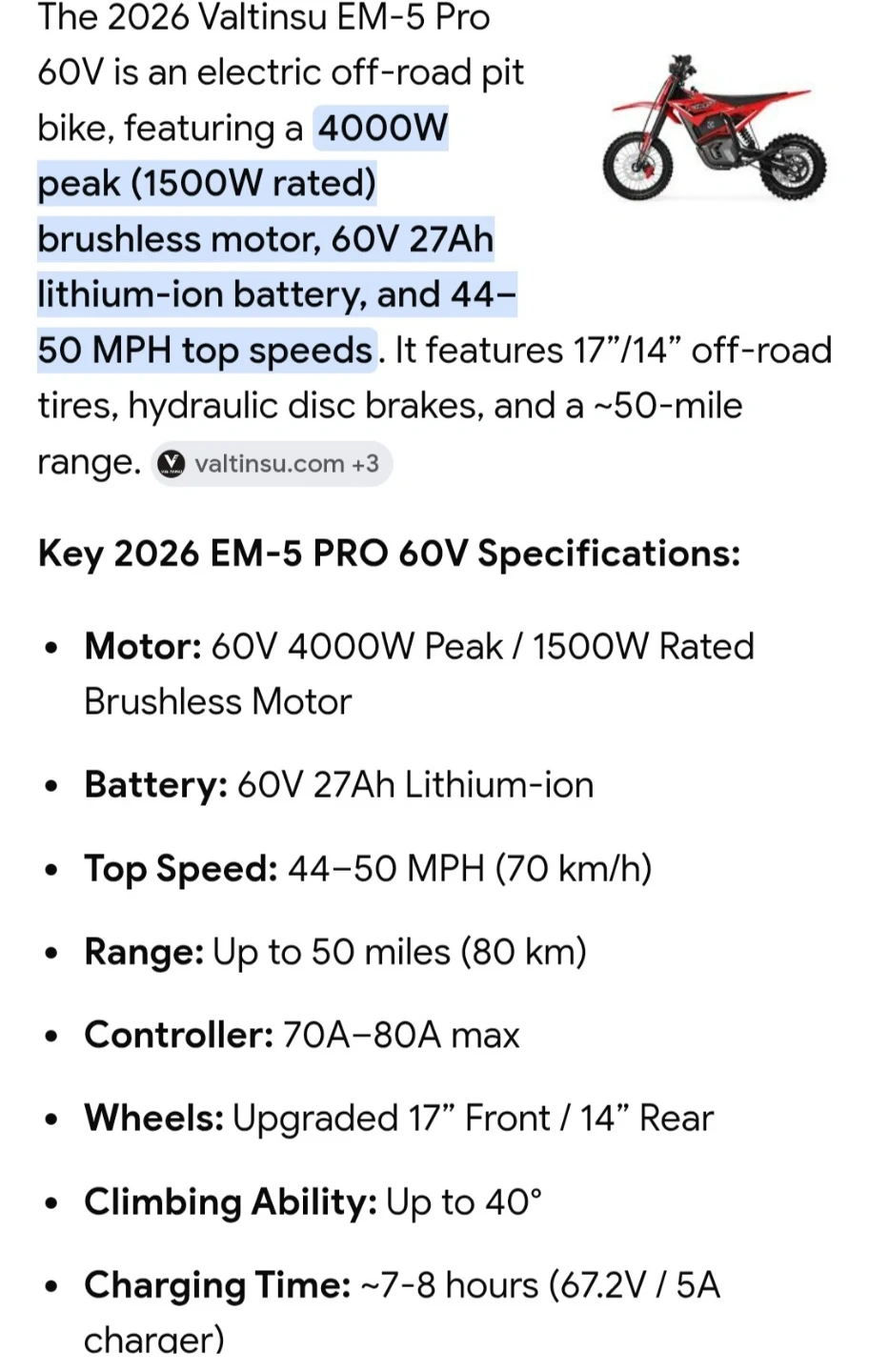 VALTINSU electric dirt bike in bright yellow. It's powered by a 60V 27Ah battery offering up to 55 miles per charge. Peak power is 4800W with a max speed of 53MPH. It's great for conquering tough terrain!