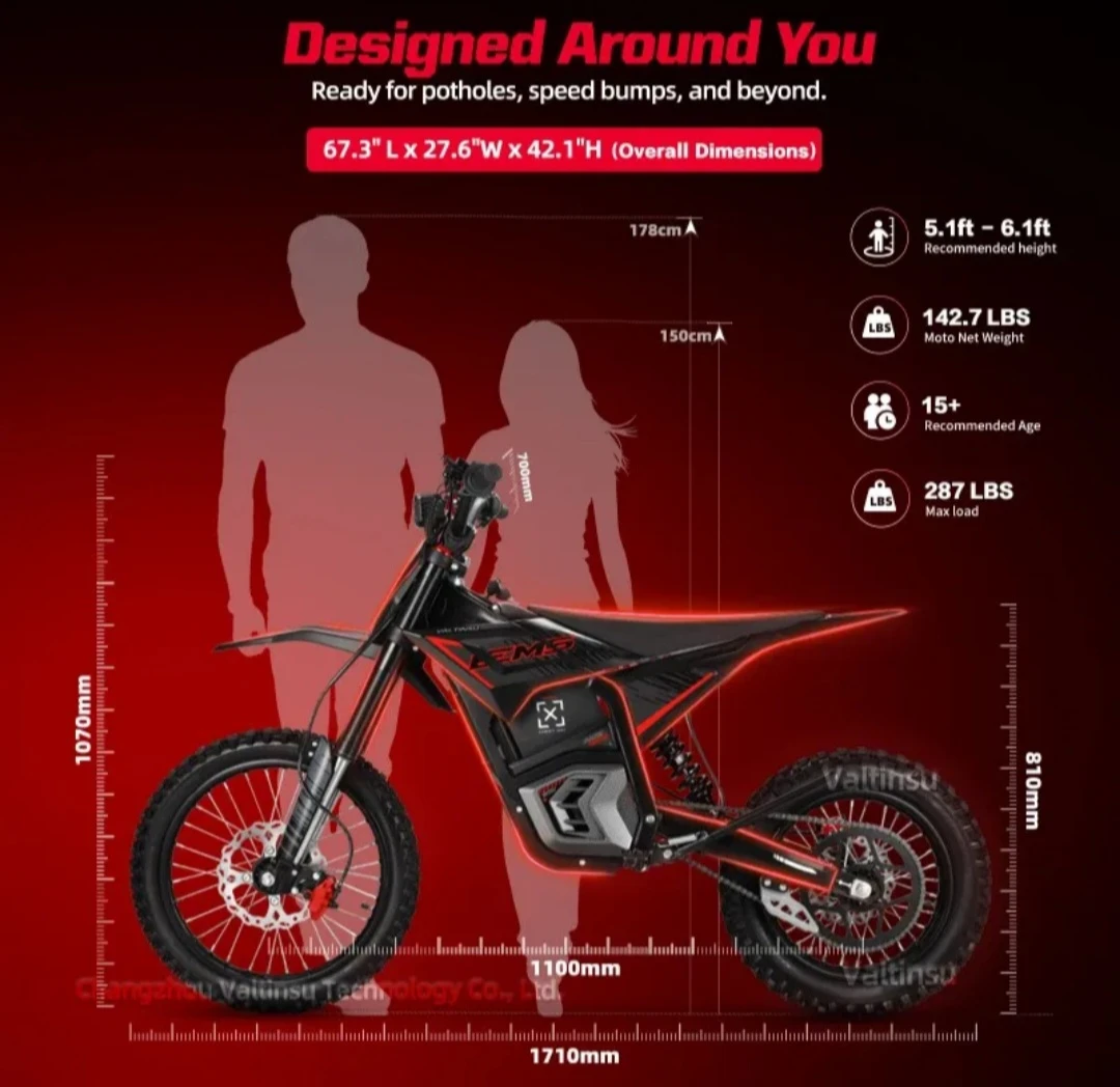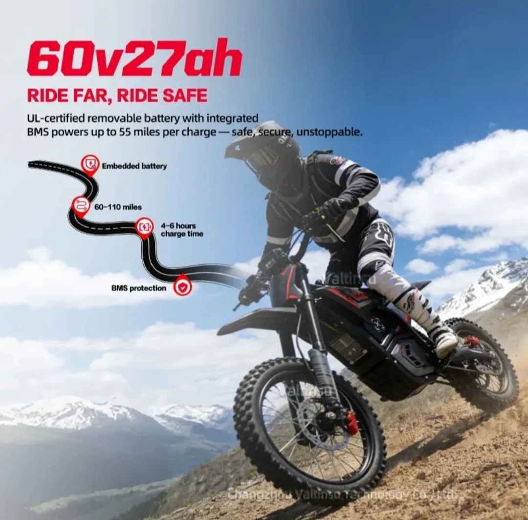VALTINSU electric dirt bike in bright yellow. It's powered by a 60V 27Ah battery offering up to 55 miles per charge. Peak power is 4800W with a max speed of 53MPH. It's great for conquering tough terrain!