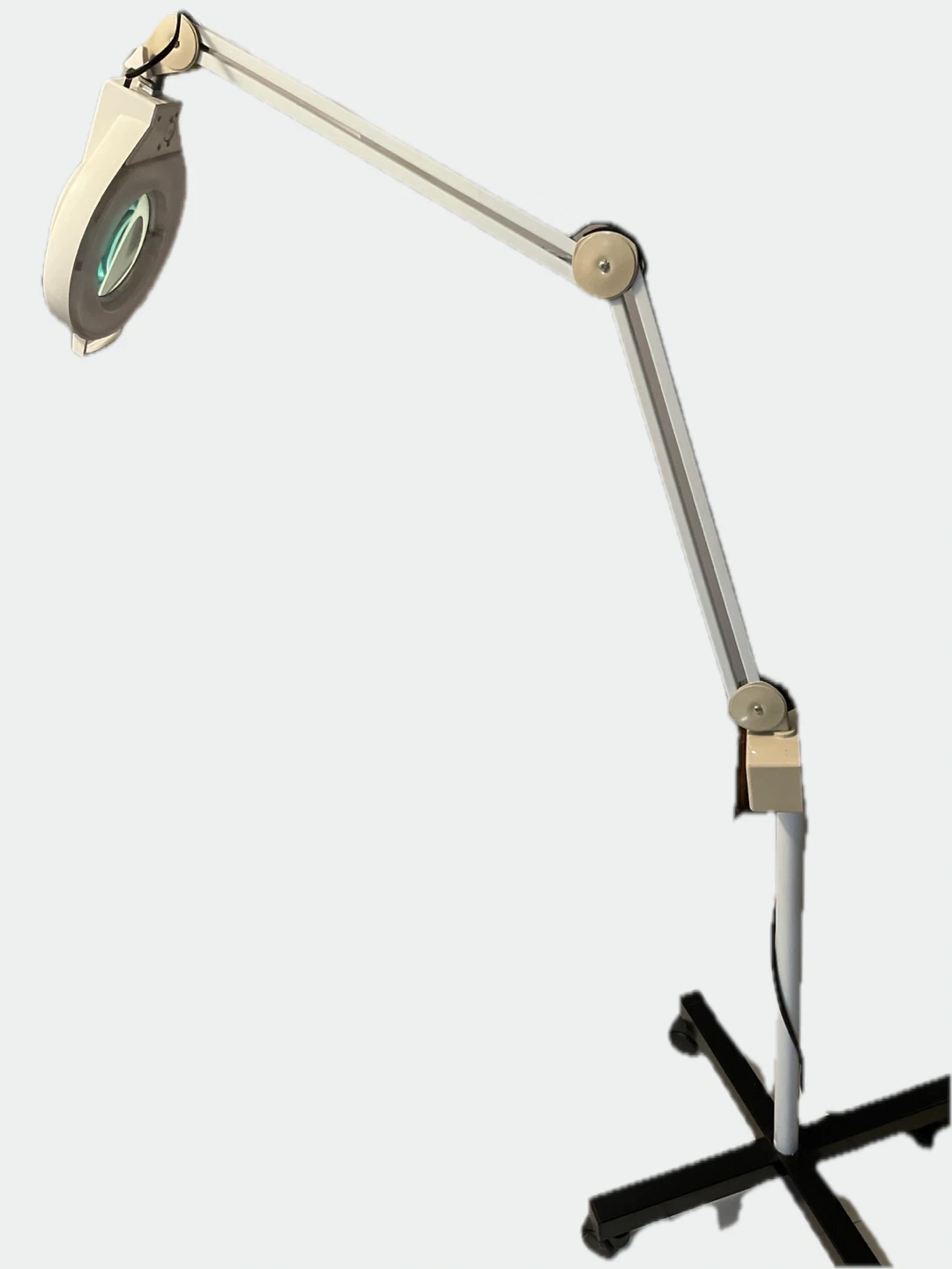 This is a floor-standing magnifying lamp with an adjustable arm. It's designed for detailed work. The lamp has a rolling base for easy movement.