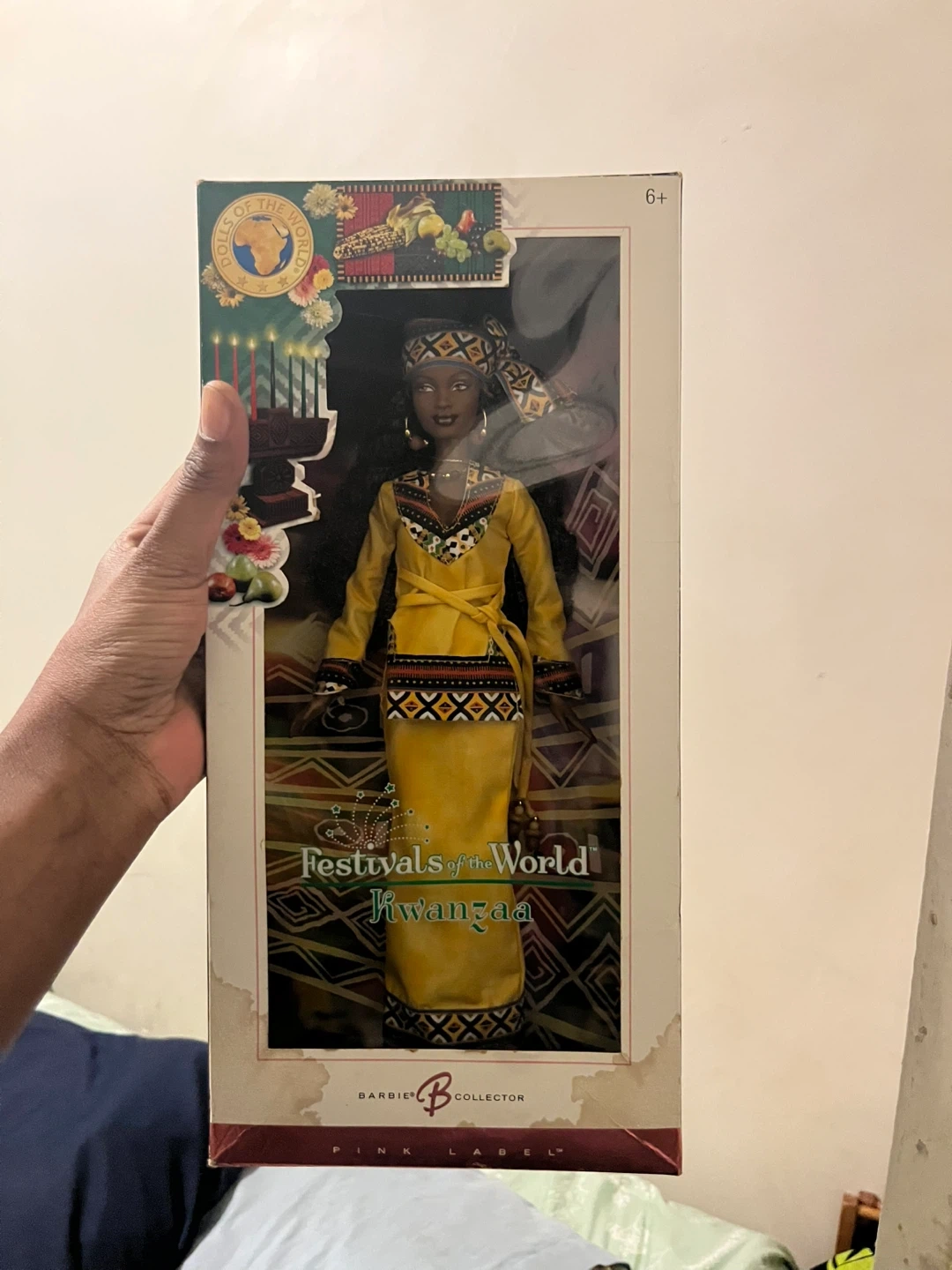 This is a Barbie from the Dolls of the World collection, celebrating Kwanzaa. It's a pink label collector doll. The doll is dressed in traditional Kwanzaa attire.