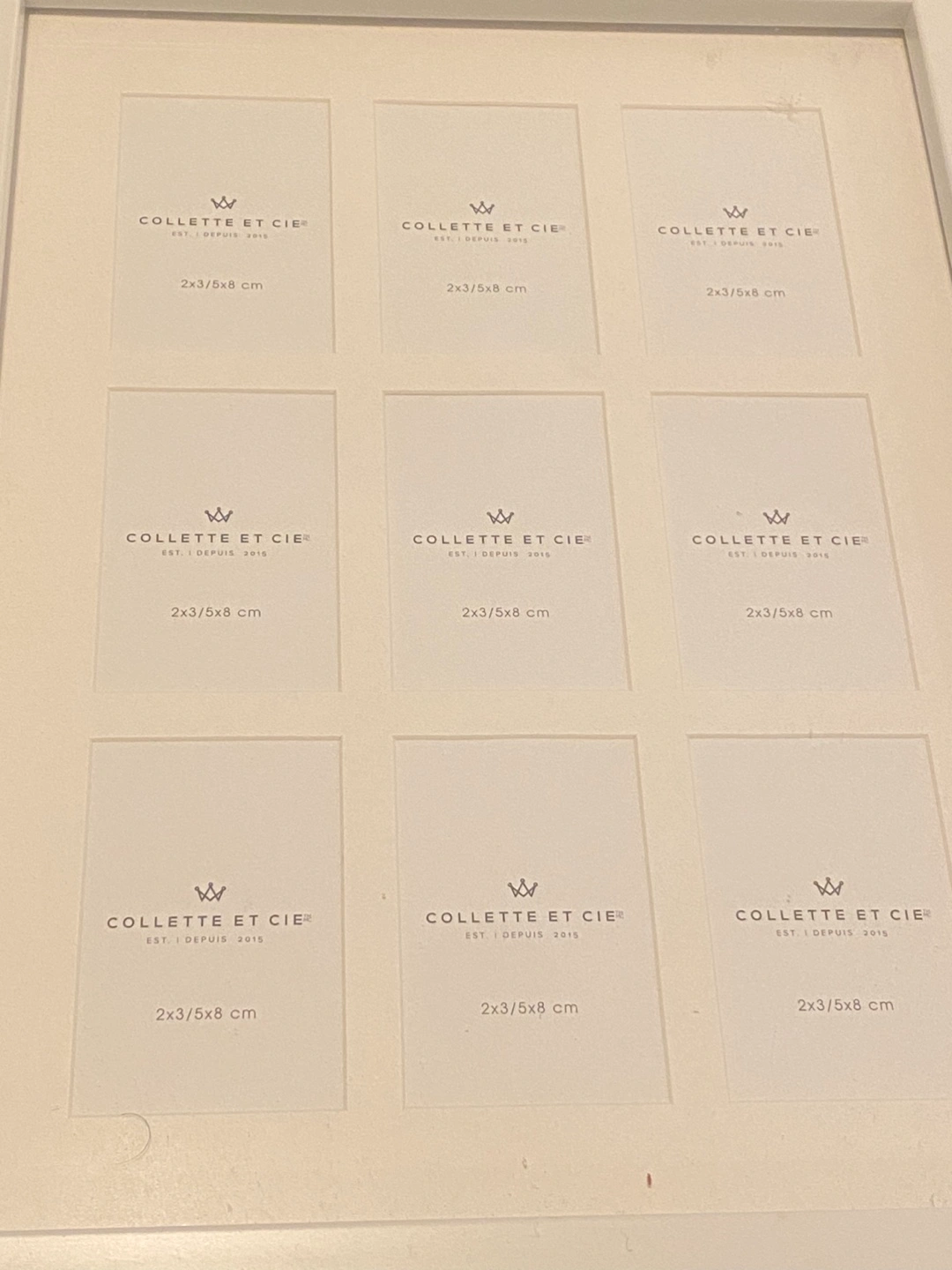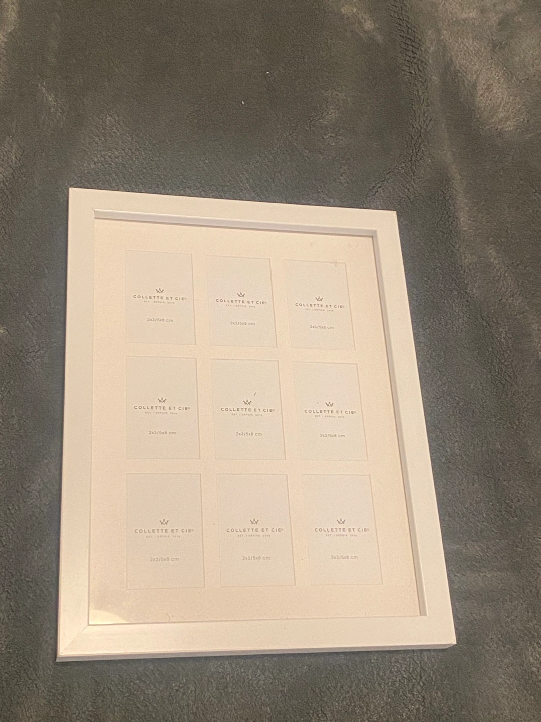 A lovely white picture frame. It's perfect for displaying multiple polaroid photos, each measuring 2x3/5x8 cm. A great addition to any home decor.