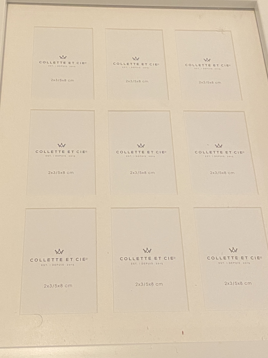 A lovely white picture frame. It's perfect for displaying multiple polaroid photos, each measuring 2x3/5x8 cm. A great addition to any home decor.
