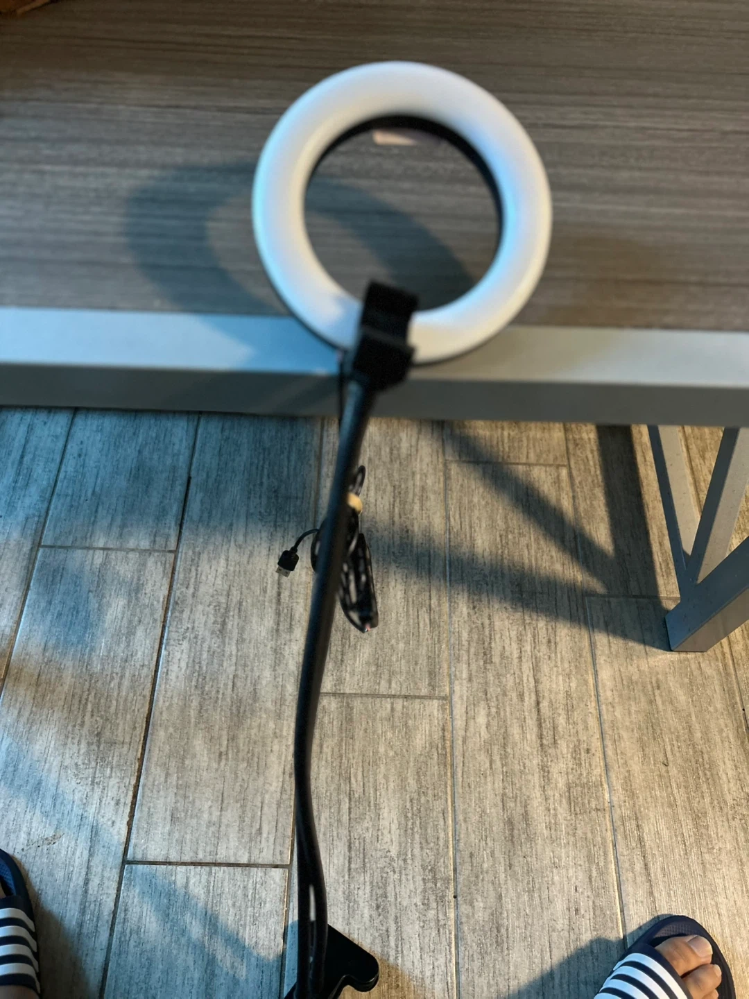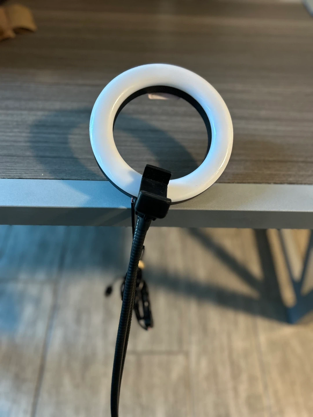 This is a clip-on ring light. It features a flexible gooseneck for easy adjustment. Great for content creation or video calls!