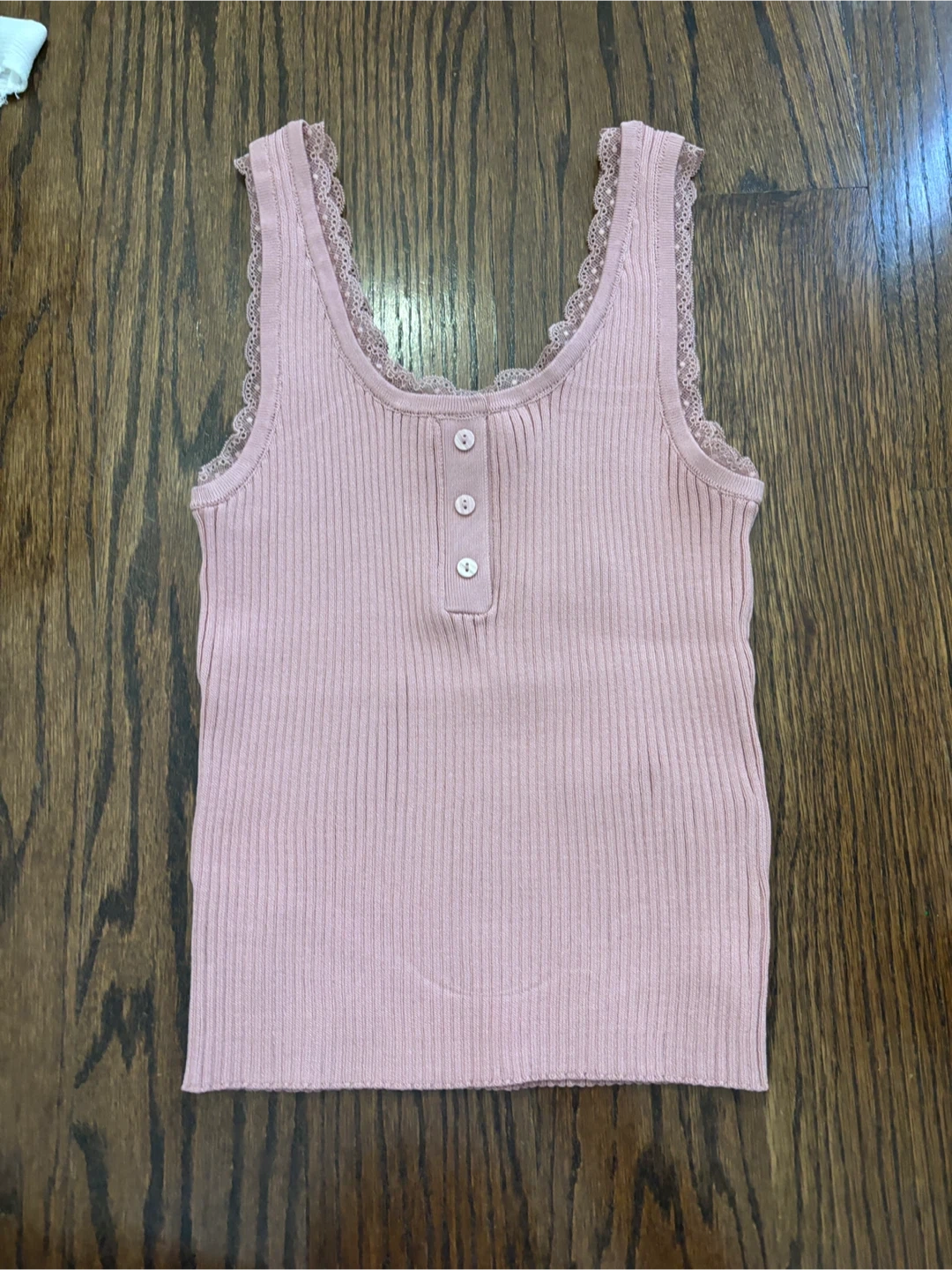 This pink tank top features a ribbed knit fabric and delicate lace trim along the neckline and straps. It has a button-up front with three small pearlized buttons. A comfortable and stylish addition to any wardrobe!