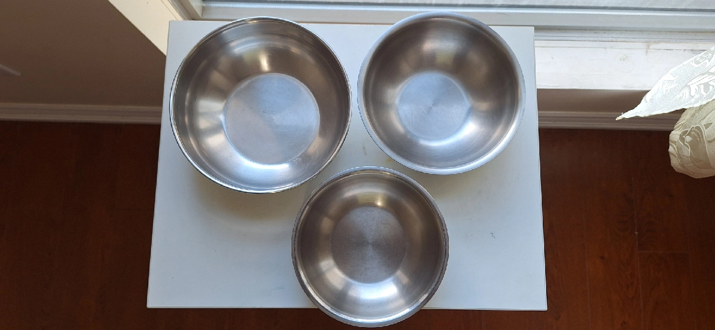 Selling a set of three stainless steel cooking bowls / karahi. These bowls are induction friendly with heavy base. The largest bowl is approximately 8 inches in diameter.