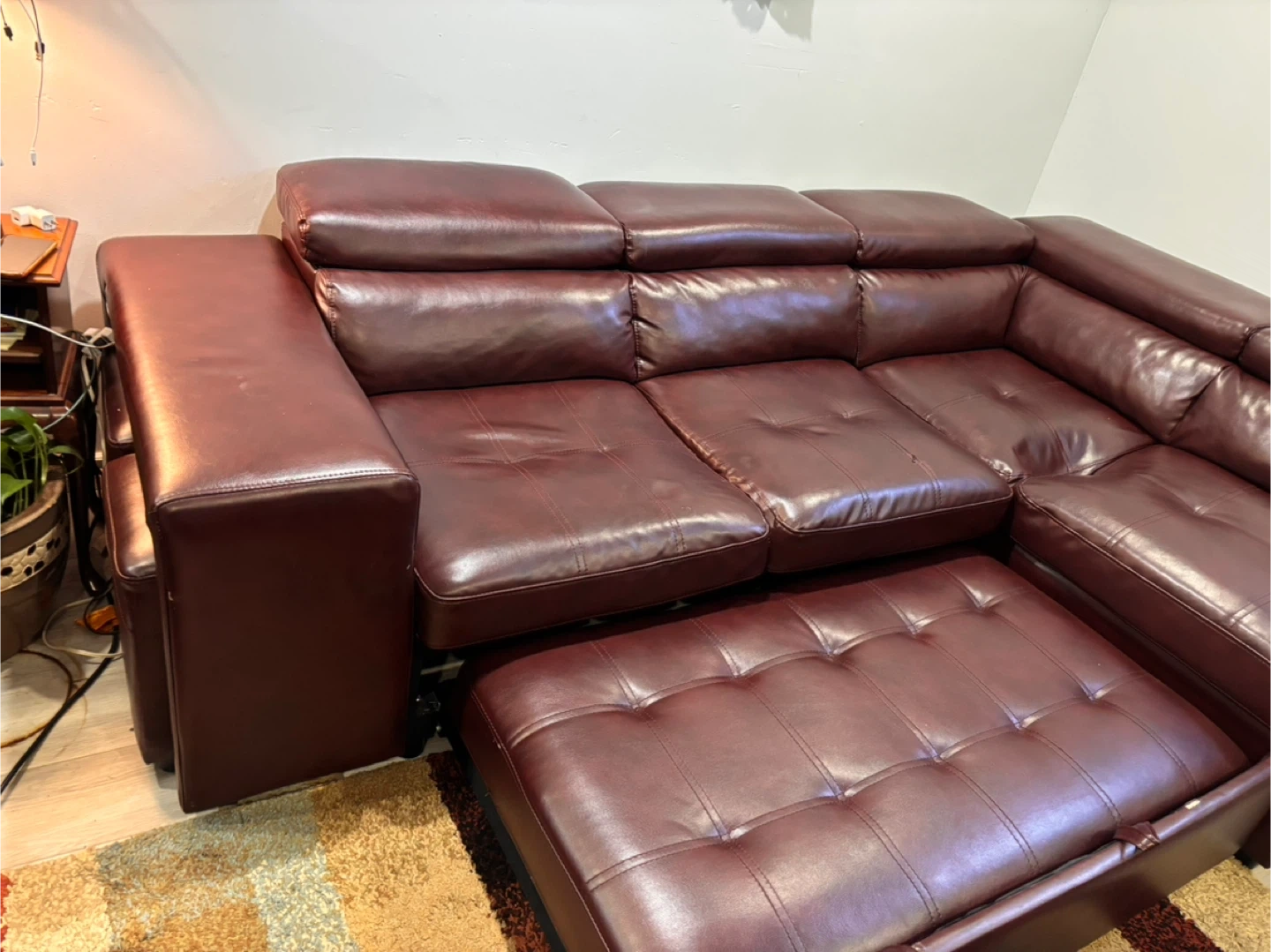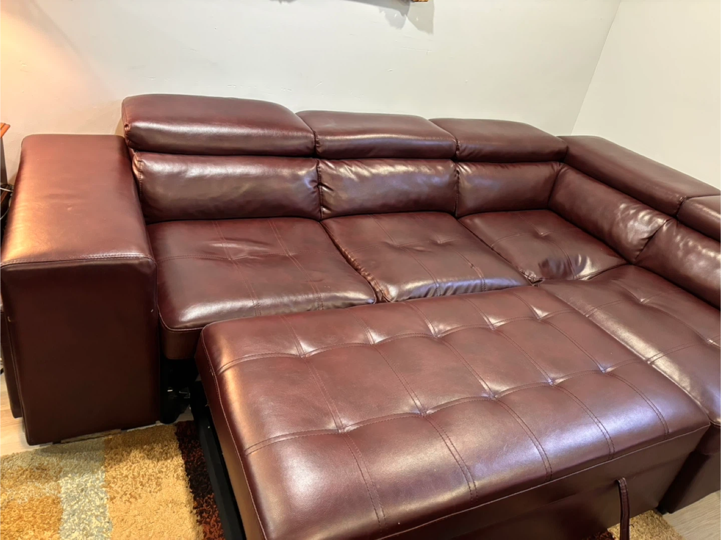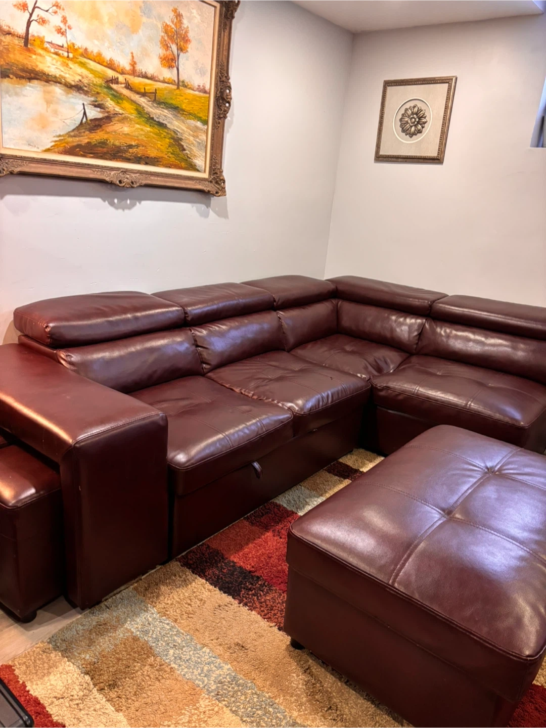 This spacious pullout sectional sofa bed is upholstered in a rich, dark reddish brown leather. It features multiple seating sections and two matching ottomans that can be used as footrests or extra seating. Storage compartments are built into the sofa sections. Built in 2 USB ports . Selling because I am moving asking price $350.