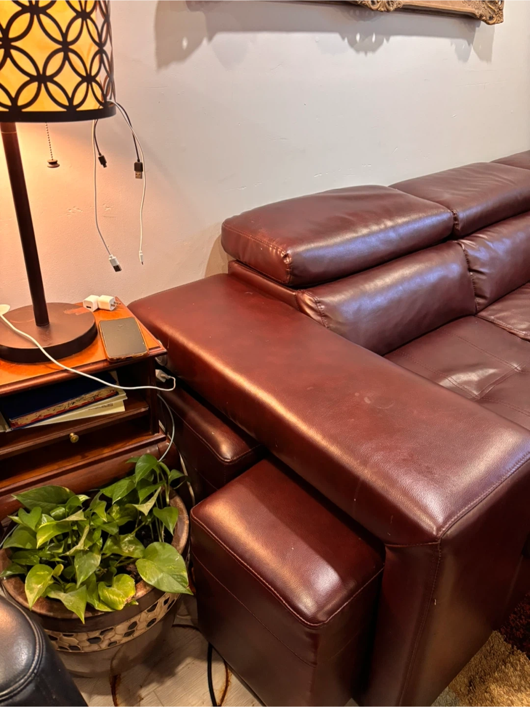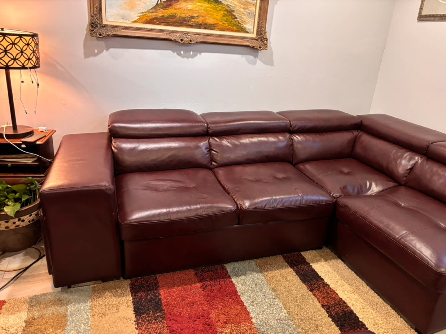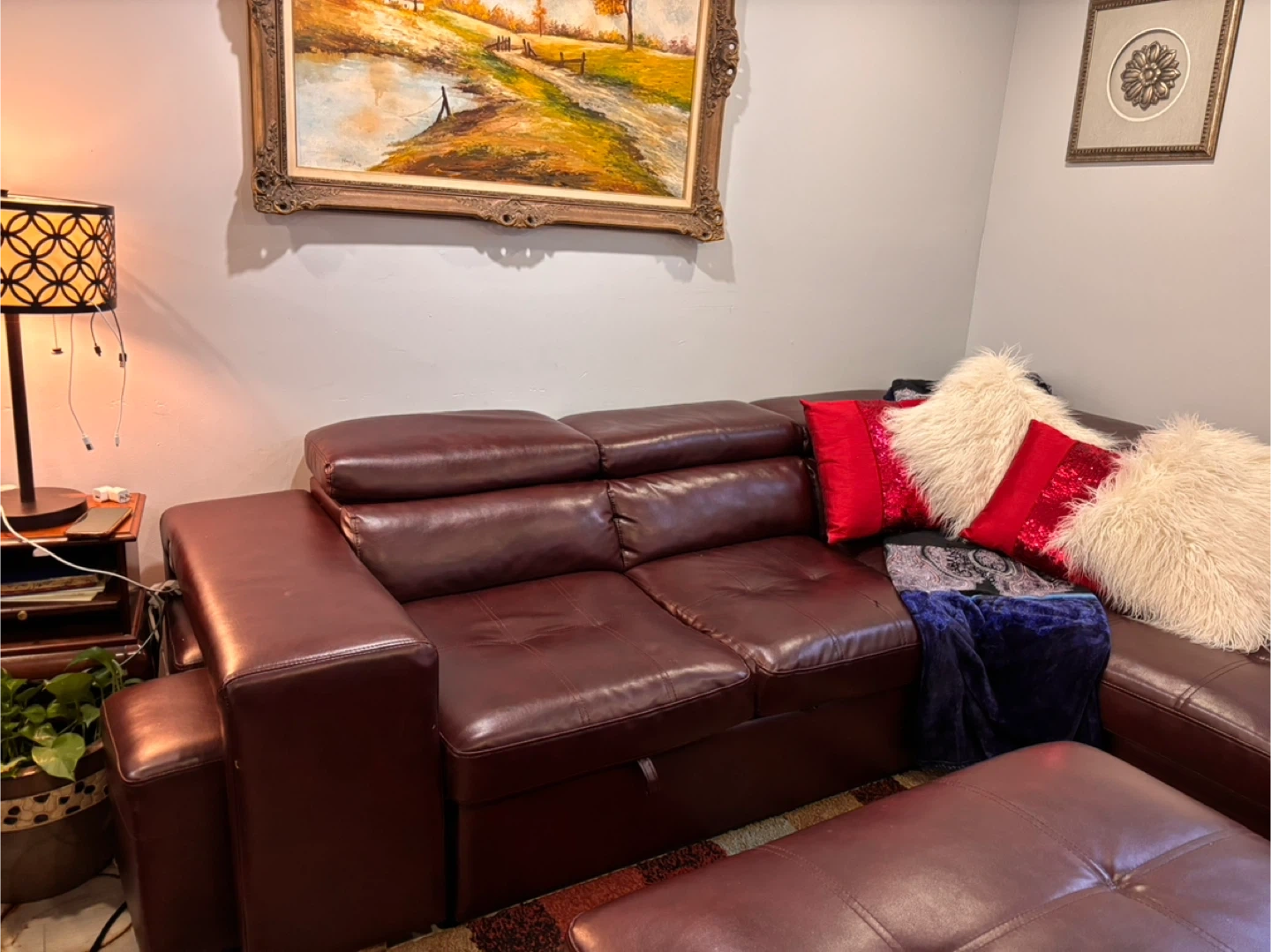 This spacious pullout sectional sofa bed is upholstered in a rich, dark reddish brown leather. It features multiple seating sections and two matching ottomans that can be used as footrests or extra seating. Storage compartments are built into the sofa sections. Built in 2 USB ports . Selling because I am moving asking price $350.