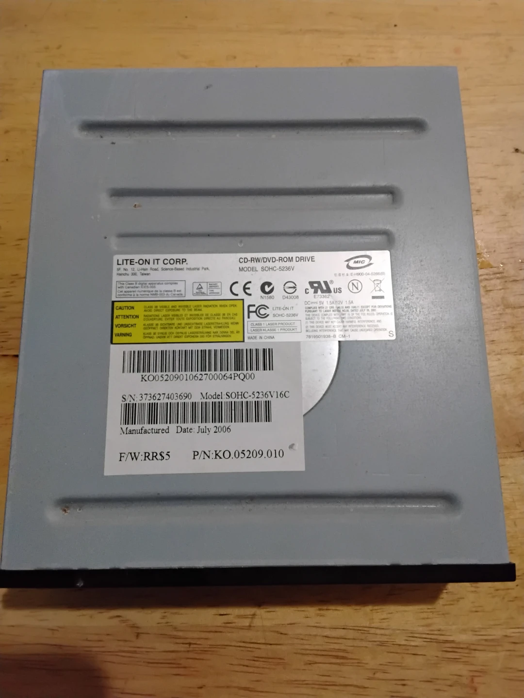 This is a Lite-On CD-RW/DVD-ROM drive, model SOHC-5236V16C. It was manufactured in July 2006. It's a Class 1 Laser Product. This drive is suitable for use in desktop computers.