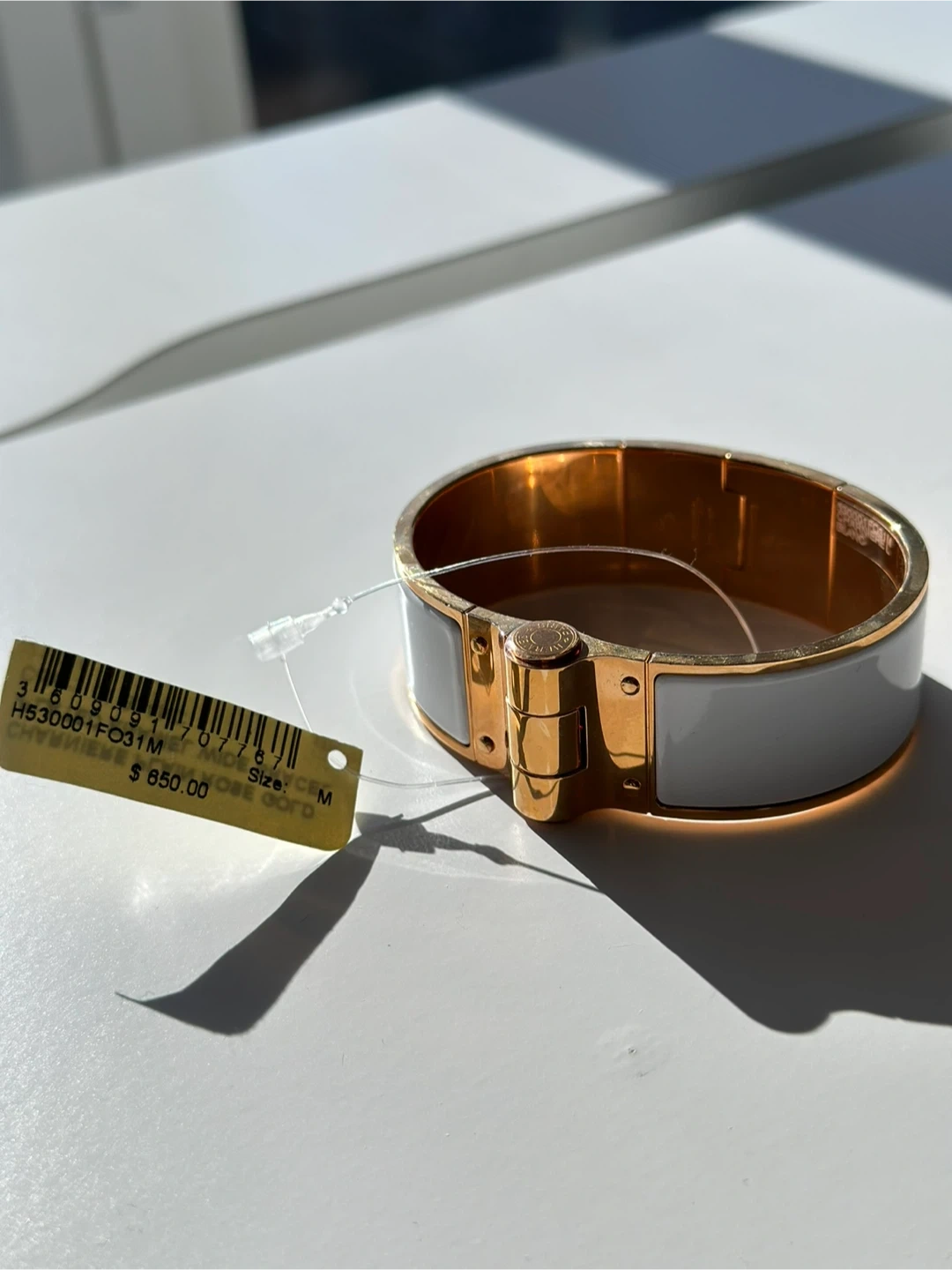 Selling a beautiful Hermès Charniere Plain Rose Gold-Plated Enamel Wide Bracelet in color 31 Blanc. This stylish bracelete features a rose gold-plated finish and is made with enamel. The size is medium. The tag shows it originally sold for $650