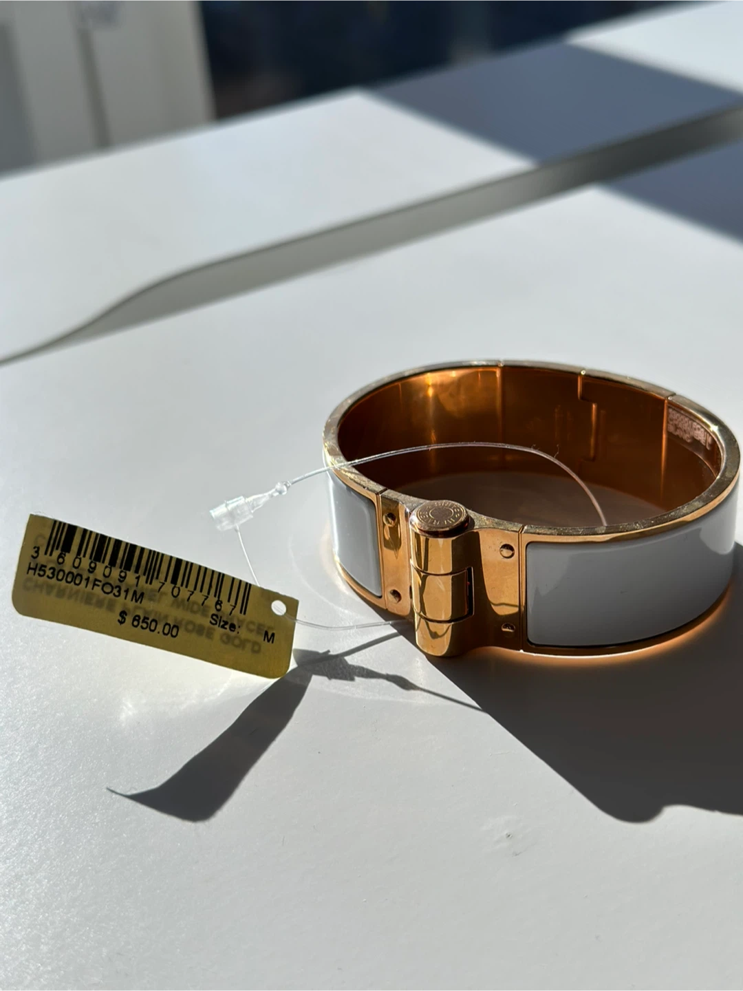 Selling a beautiful Hermès Charniere Plain Rose Gold-Plated Enamel Wide Bracelet in color 31 Blanc. This stylish bracelete features a rose gold-plated finish and is made with enamel. The size is medium. The tag shows it originally sold for $650