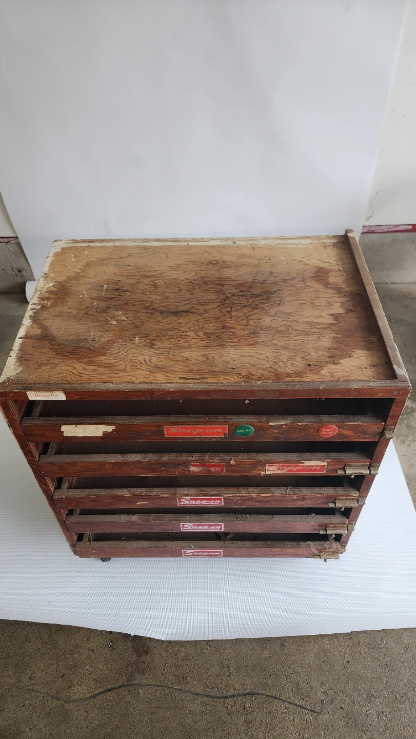 Vintage Snap-on wood 5 drawer tool chest organizer. It's great for organizing tools and small parts. This unit has wheels for easy transport and a peg board on one side. Would make a great refinishing project if you're into that!