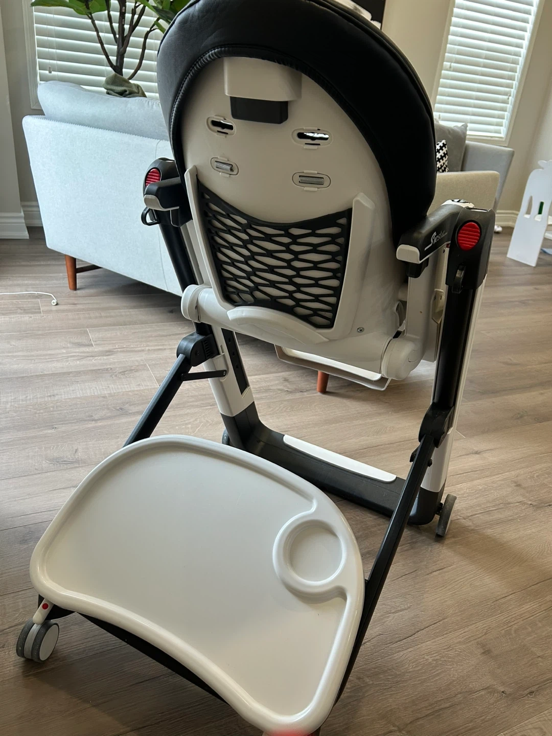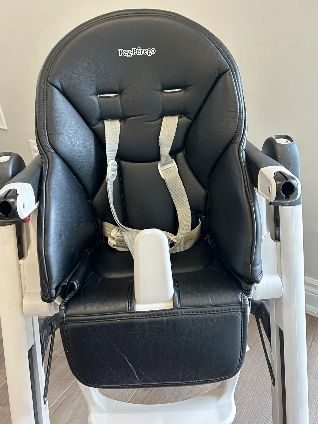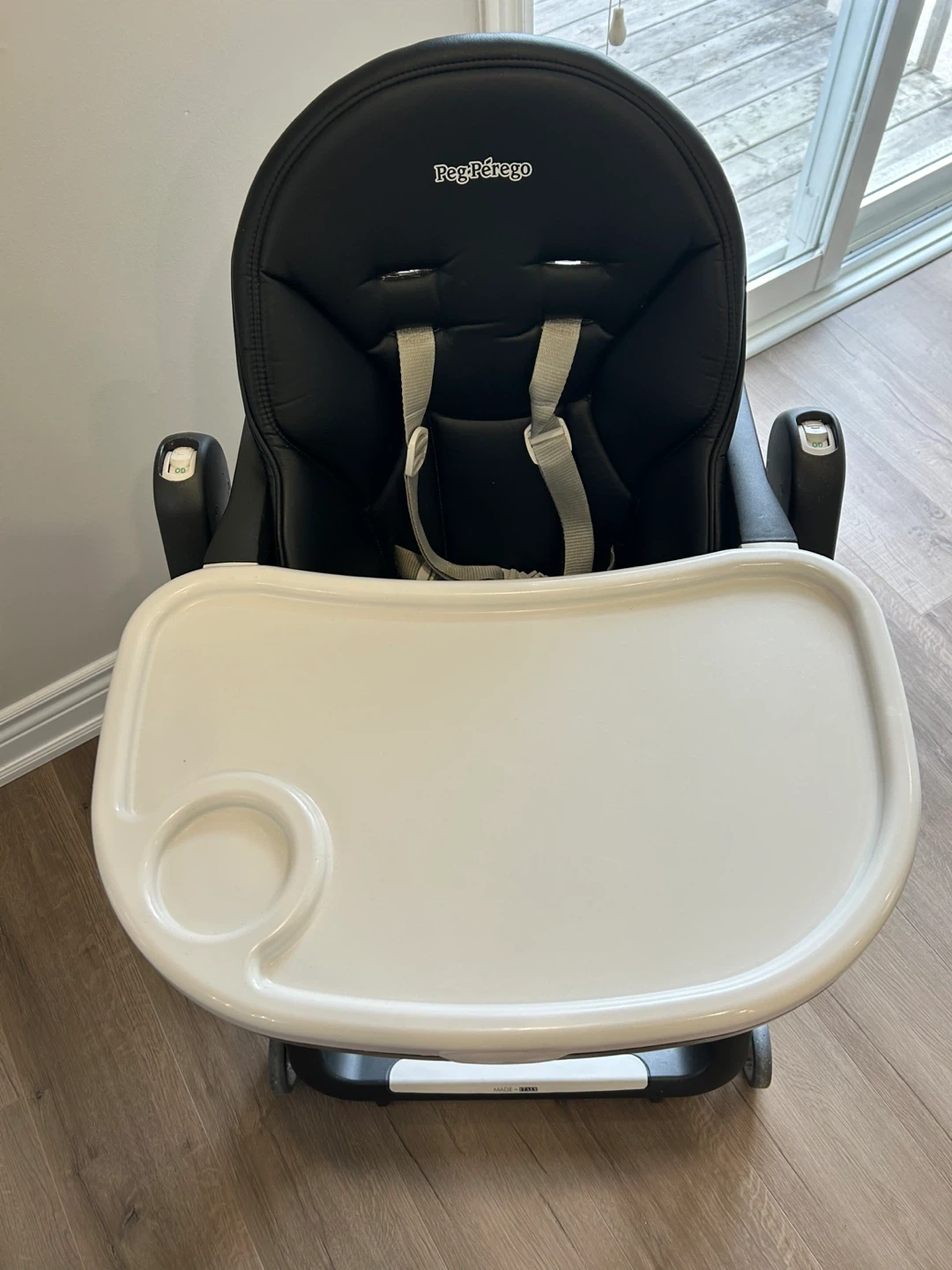 Peg-Pérego high chair with a black leather seat and white tray. It features a five-point harness for safety. This chair is adjustable for your child's comfort and includes a removable tray.