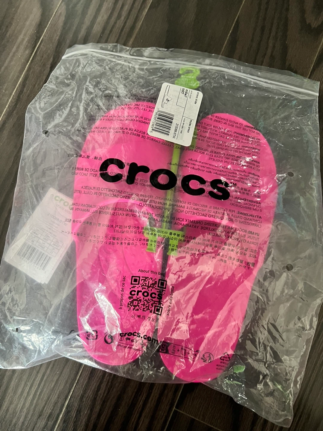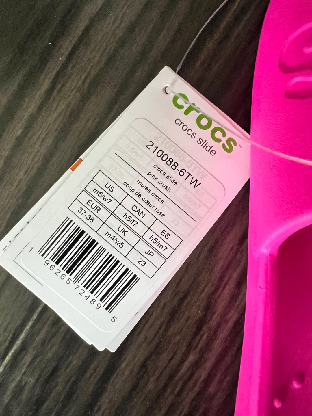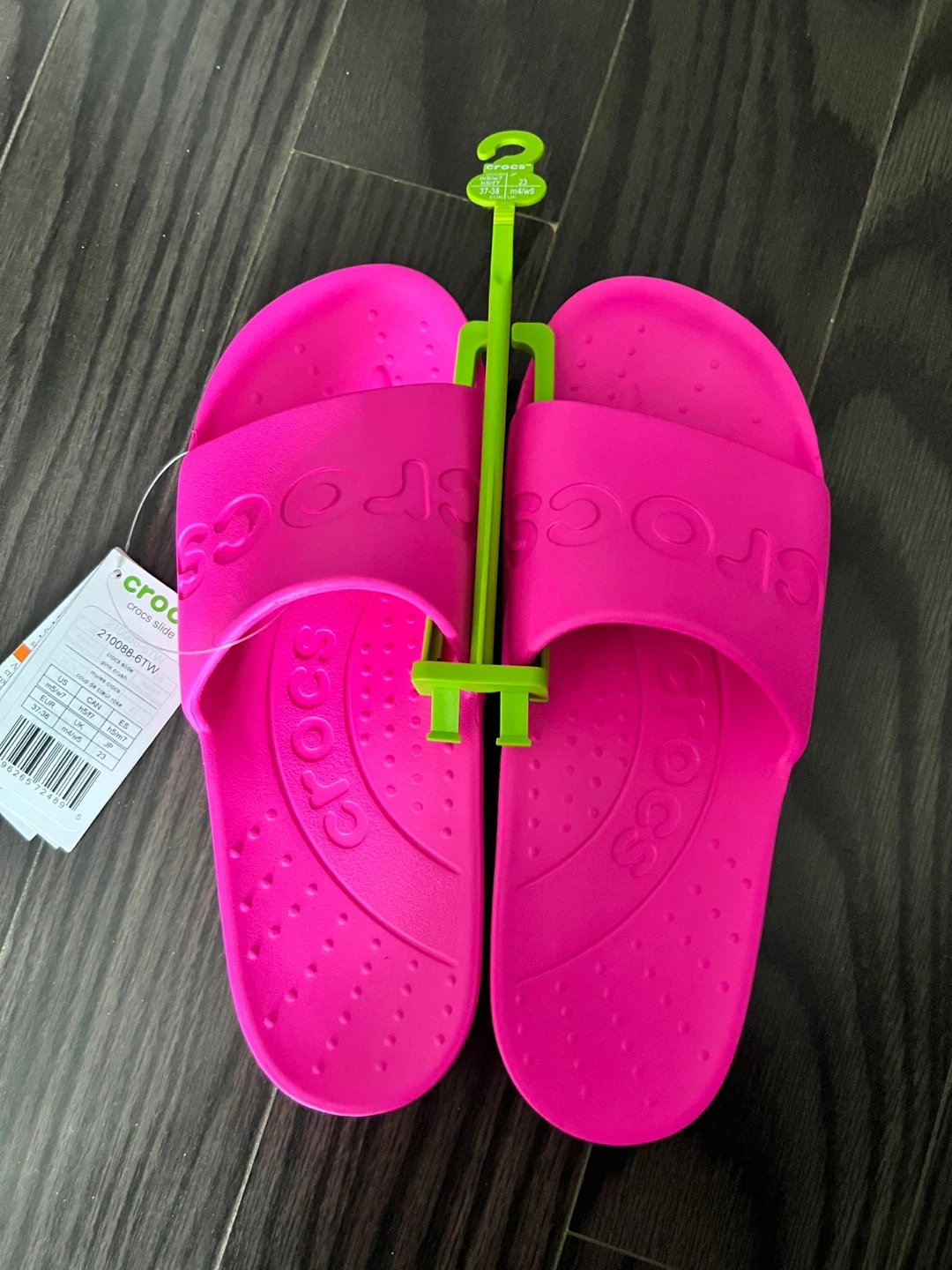 Brand new Crocs pink crush slides. These are women's US size 7, which is equivalent to men's US size 5, EUR 37-38, and UK 4.5.