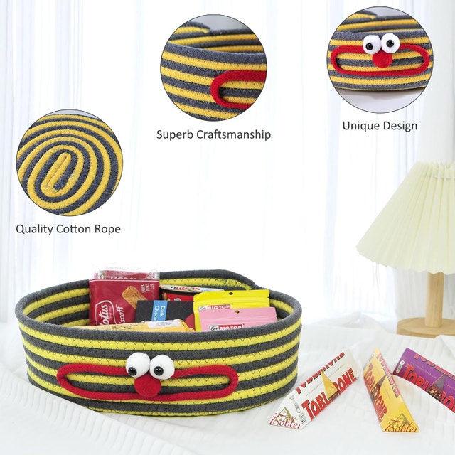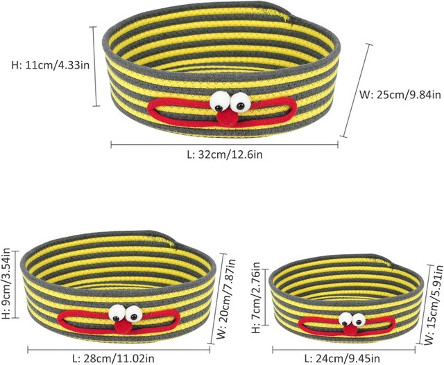 3 pcs Cute Small Storage Baskets - Round Woven Cotton Rope Baskets with Silly Faces, Decorative Gift Box with Ribbon, Dog Toy Organizer, Fruit, Remote & Desk Storage (Yellow) - Ideal Gift Basket - Color box packing, come with 1pc blue mesh, 1pc pink mesh and 1 gift wrap ribbons. This set of 3 rope nursery storage basket can be your best gift choice for Valentine's day, Easter, Graduation Gift, Christmas, New Year, baby shower, birthday.