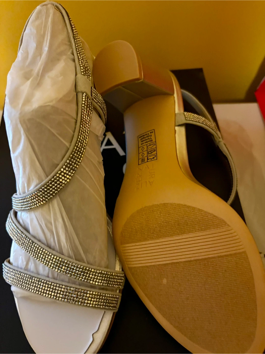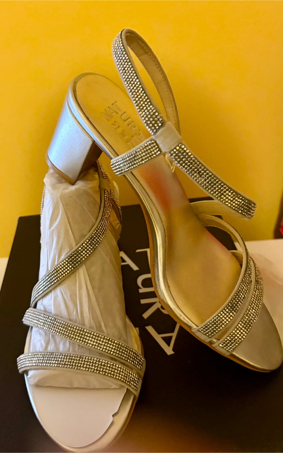 These stylish Naturalizer sandals feature a silver hue with dazzling rhinestone embellishments. They have a comfortable block heel and a secure ankle strap. These would be great for dressing up any outfit for an evening out!