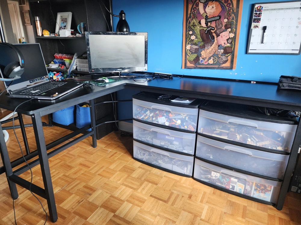 L-Shaped Desk (dimensions in picture) fits perfectly underneath