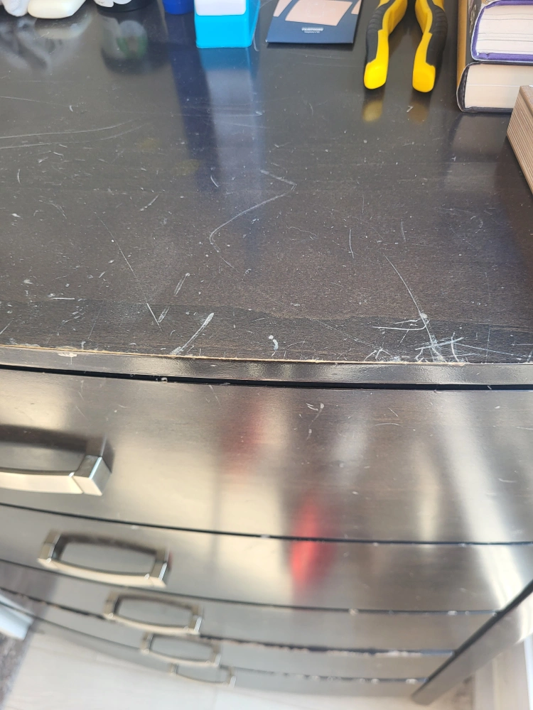 good size and storage. scuffs and scratches on the surface. the second tp lowest drawer has discolored wood at the bottom, which is currently covered with some kitchen material(no damage just aesthetic difference). Well loved but still good!