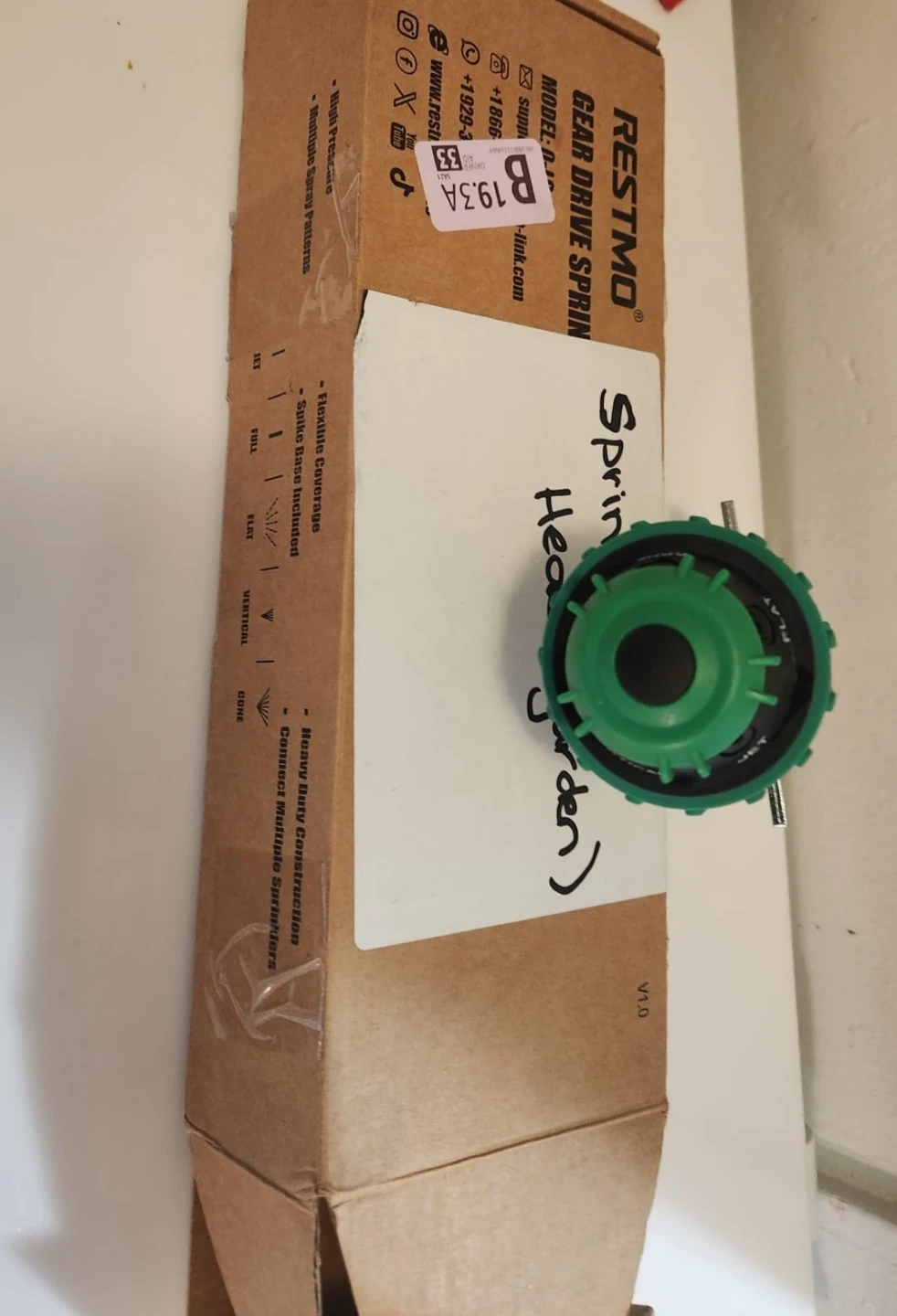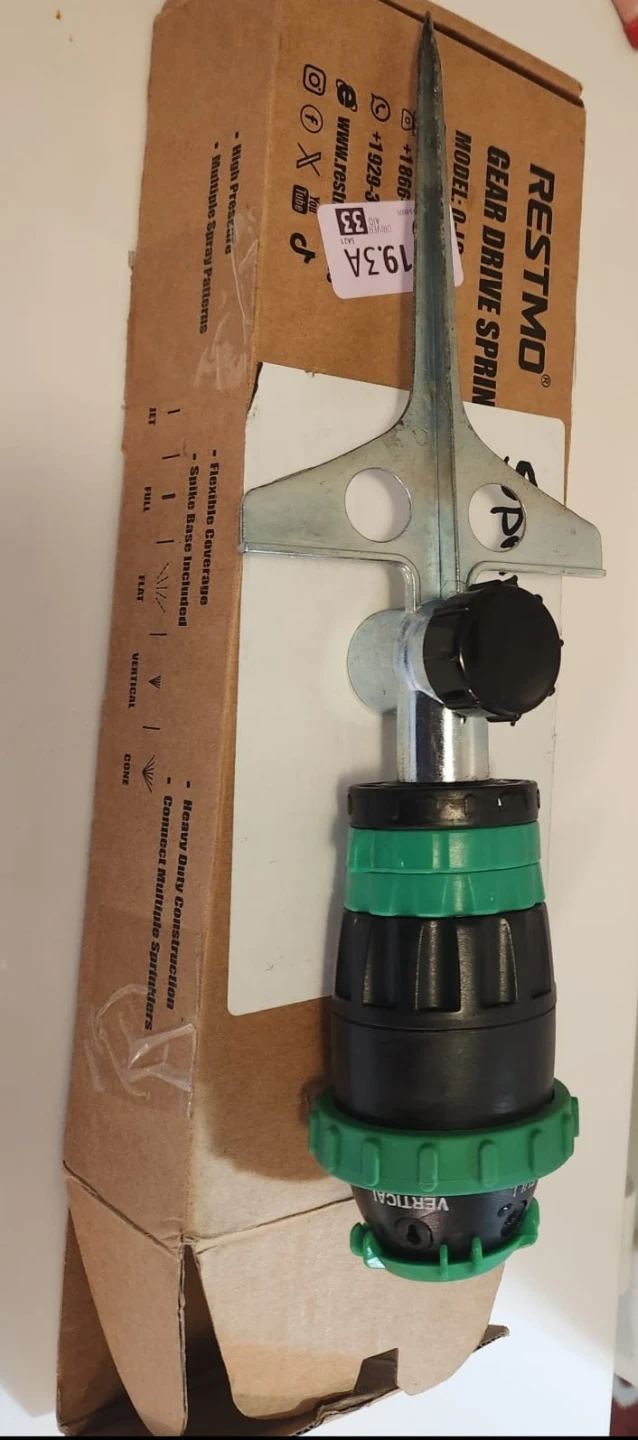 This is a RESTMO Gear Drive Sprinkler with a spike base. It offers multiple spray patterns and flexible coverage. It's built with heavy-duty construction. This sprinkler is useful for watering lawns and gardens.