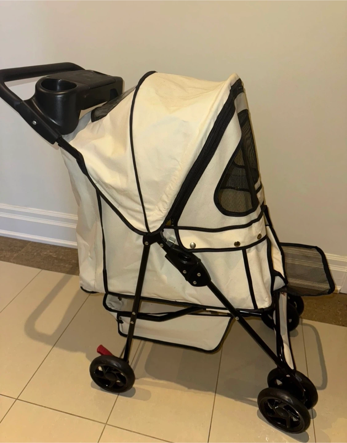GO Pet Club pet stroller in white and black. It's a convenient way to travel with your pet. Includes a storage basket and cup holders. When folded, it measures 85cm long, 45cm high, and 25cm wide.