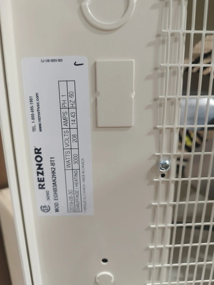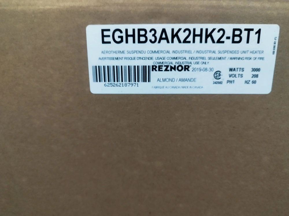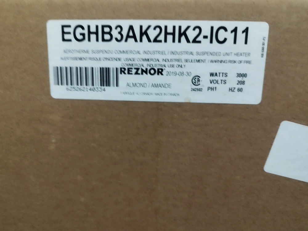 BNIB Commercial/industrial suspended unit heater. 3000 watts, 208 volts, 60 Hz. Almond colour. New in box. $800