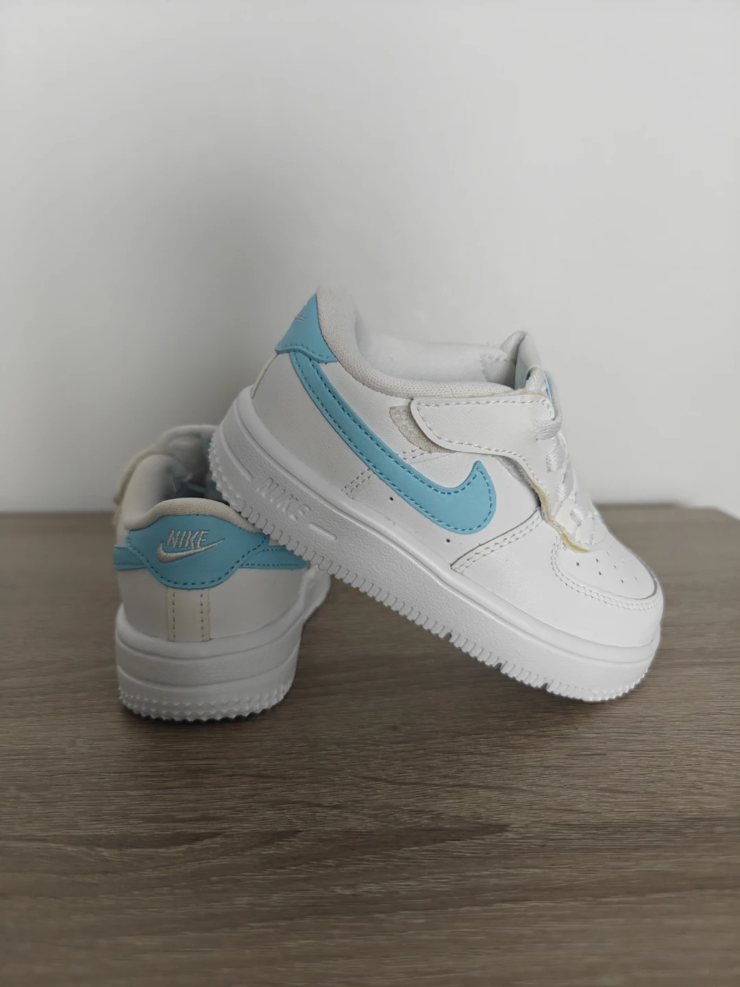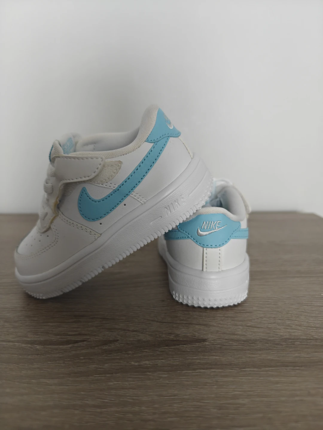 Toddler Nike Force 1 Low Easyon TD sneakers in white and blue. Hook-and-loop closure for easy on and off. Made in India.
