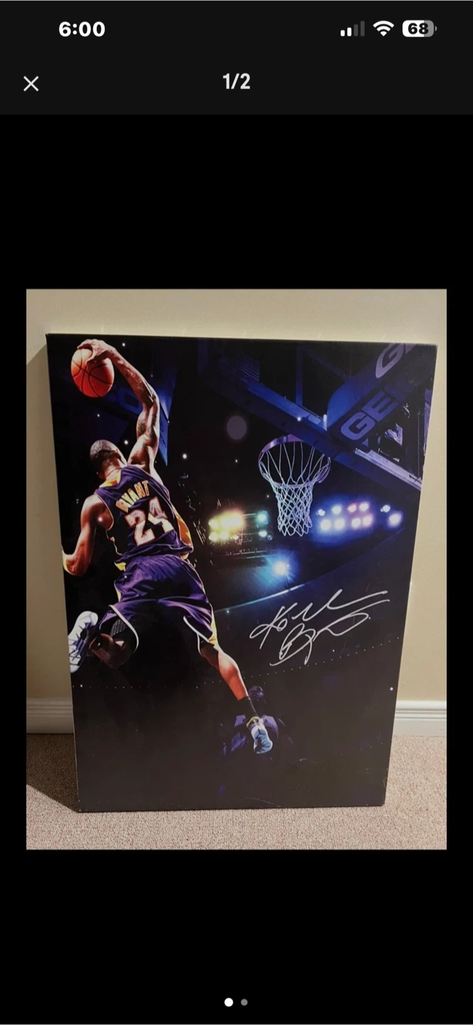 This canvas print features Kobe Bryant in his iconic purple and gold Lakers uniform, soaring for a dunk. It's signed by Kobe Bryant himself! Ready to hang with wire included on the back.