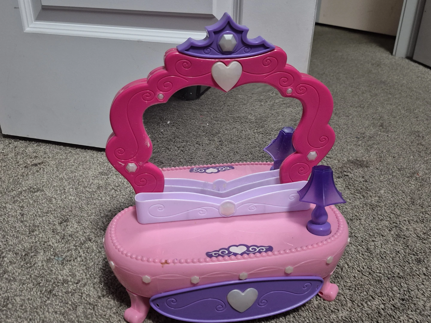 This adorable pink and purple toy vanity set is perfect for a little one! It comes with a mirror and a little lamp. There are some signs of use, but it's still lots of fun for imaginative play!