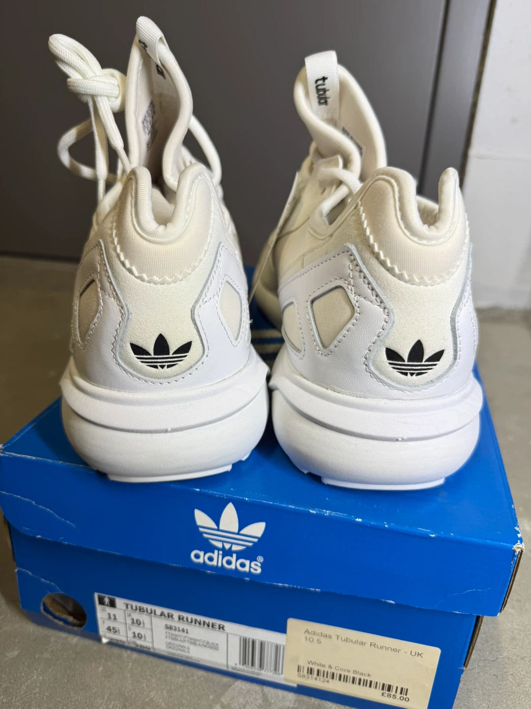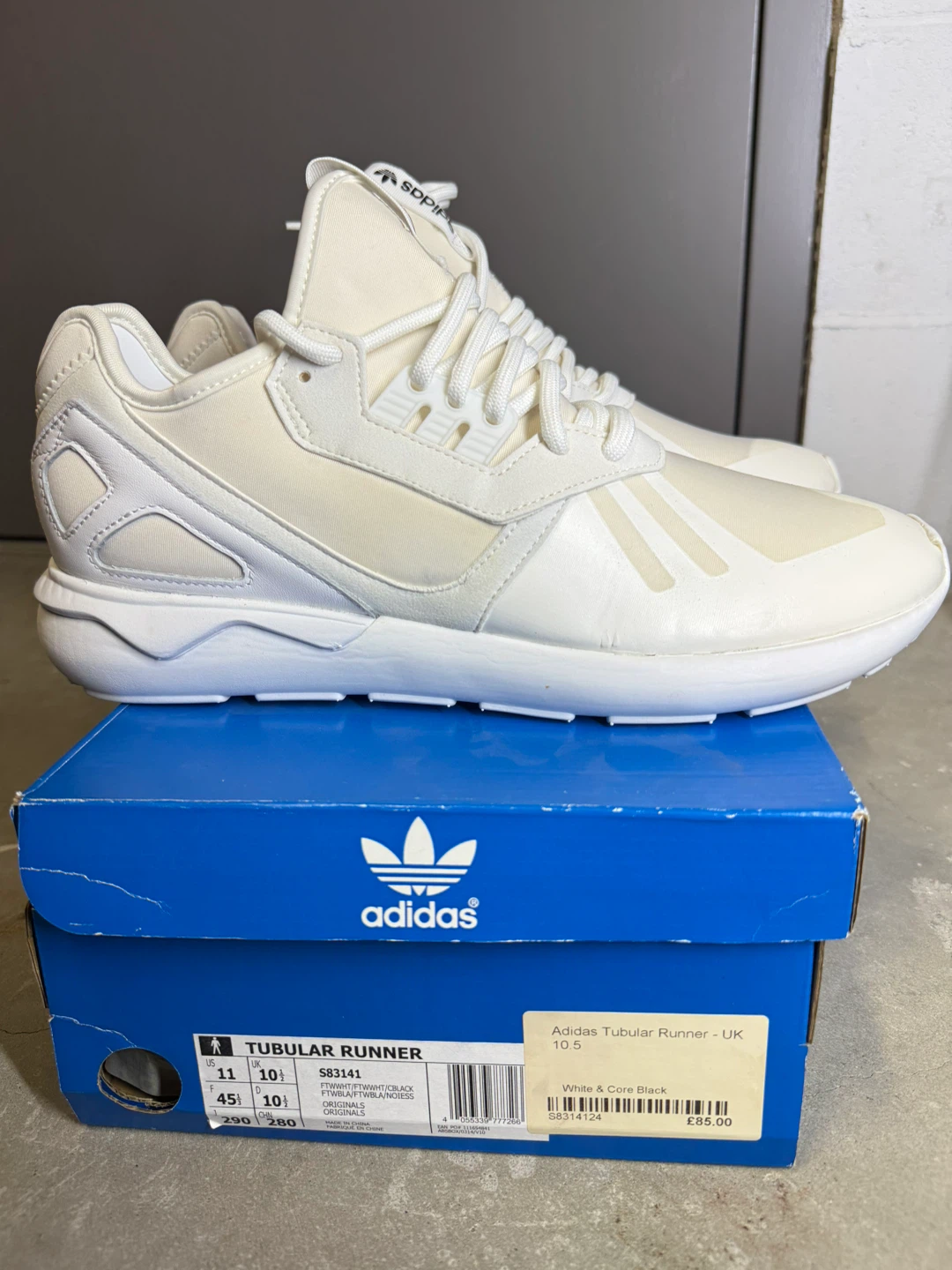 Adidas Tubular Runner sneakers in a clean white colour. Original box included. Size is UK 10.5, US 11, EU 45, 290mm. Discounted because its aged.