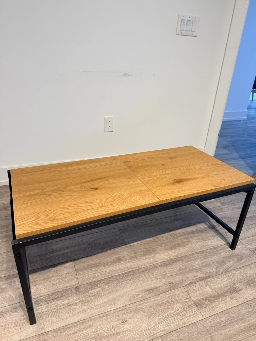 A contemporary coffee table featuring a warm, wood-grain top with a clever lift-up section that reveals storage space. It's supported by a sturdy black metal frame. This table adds both style and functionality to your living room!