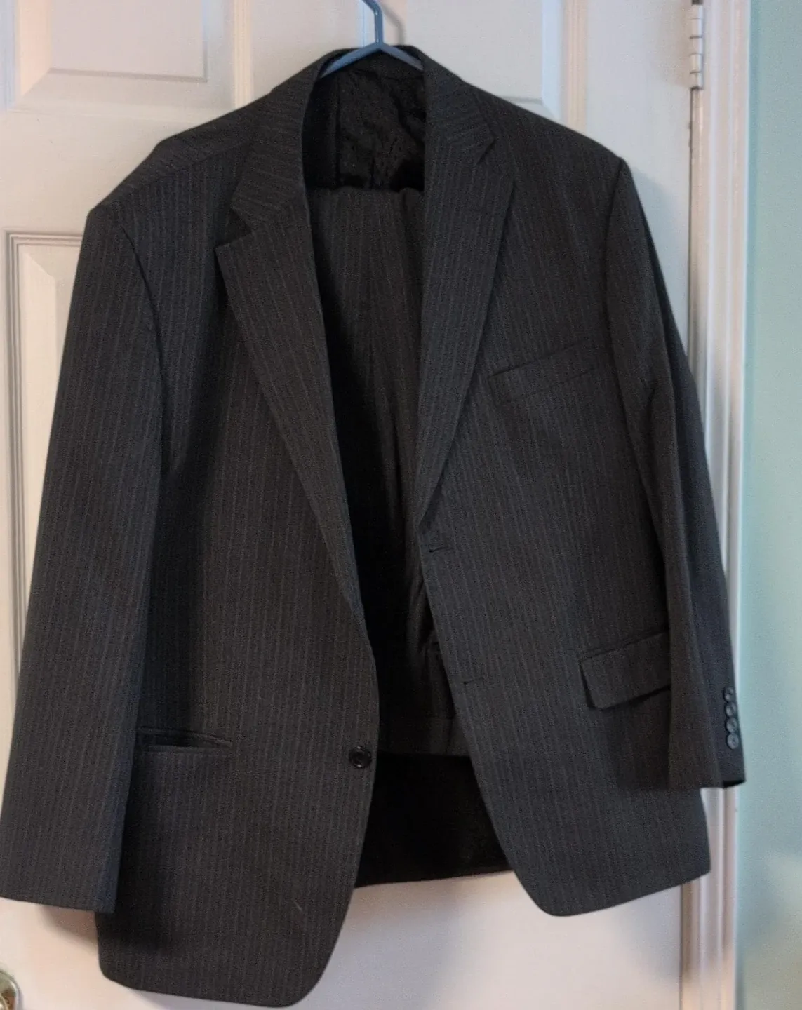 A charcoal grey suit with a classic pinstripe pattern. This two-piece set includes a jacket and matching trousers. It's a versatile option for formal occasions.