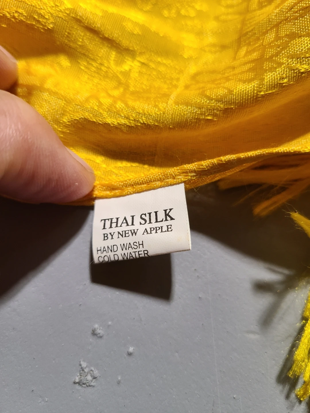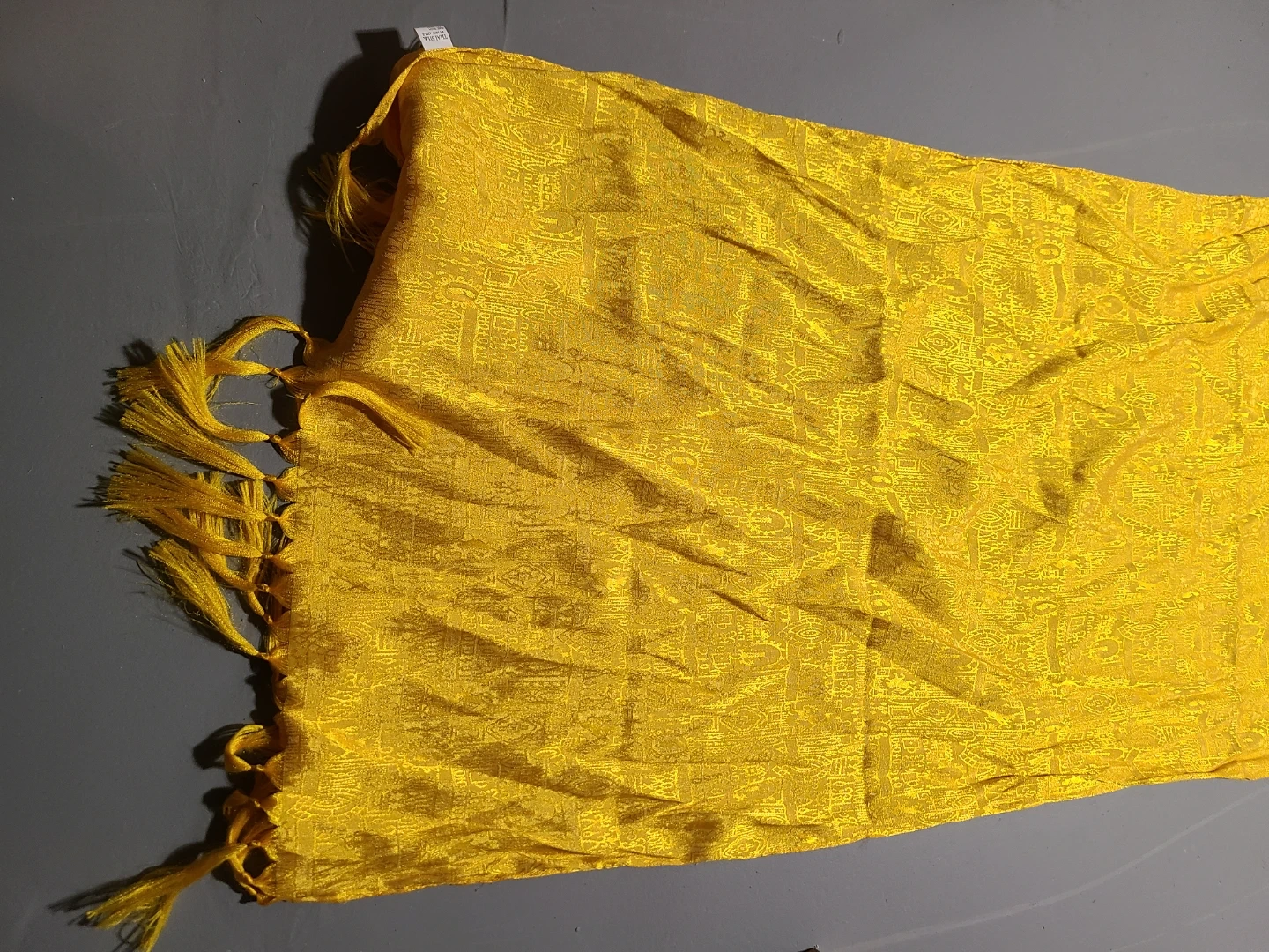 This is a Thai silk scarf by New Apple. It's yellow with a beautiful shine; it has a patterned design and fringed edges. Could also be used as a table runner.