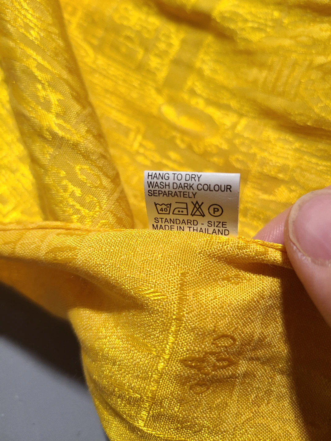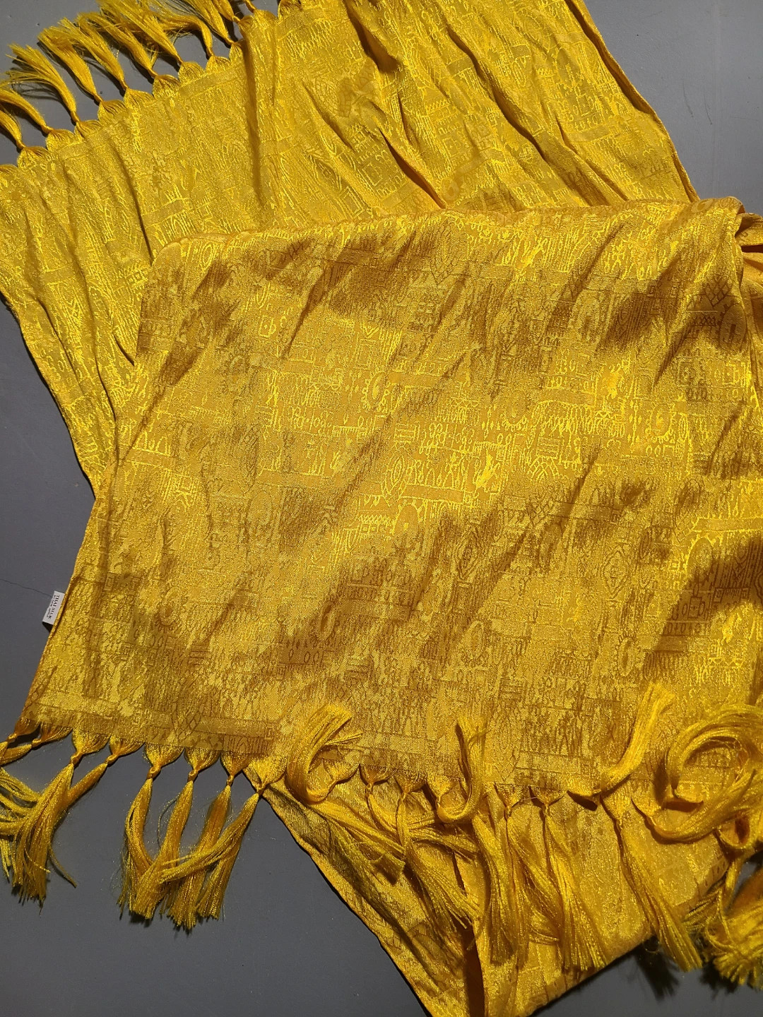 This is a Thai silk scarf by New Apple. It's yellow with a beautiful shine; it has a patterned design and fringed edges. Could also be used as a table runner.