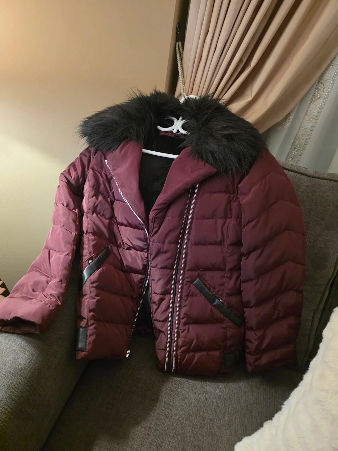 Stylish maroon puffer jacket with a faux fur collar. It features asymmetrical zipper detailing and faux leather accents on the pockets. This jacket is designed for warmth and a fashionable look.