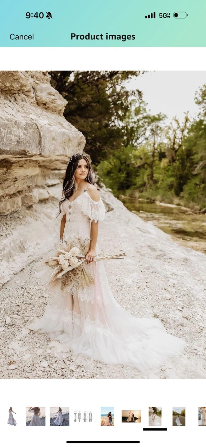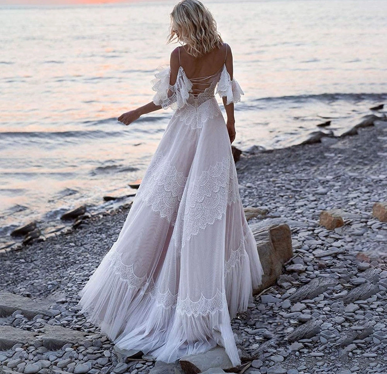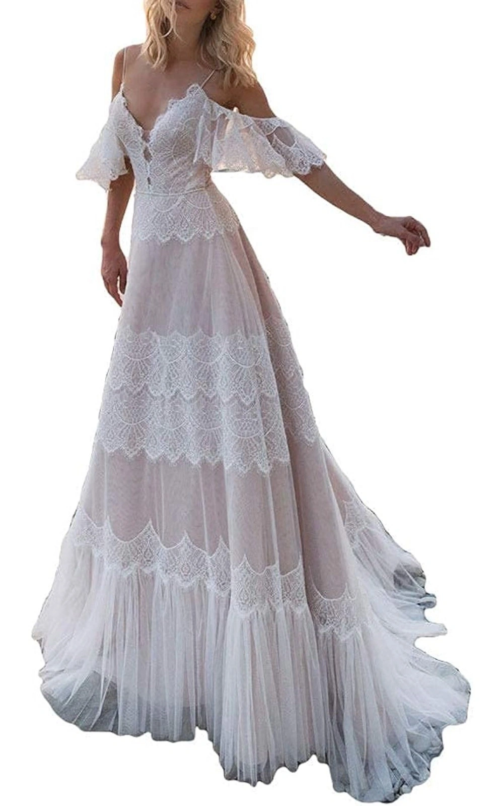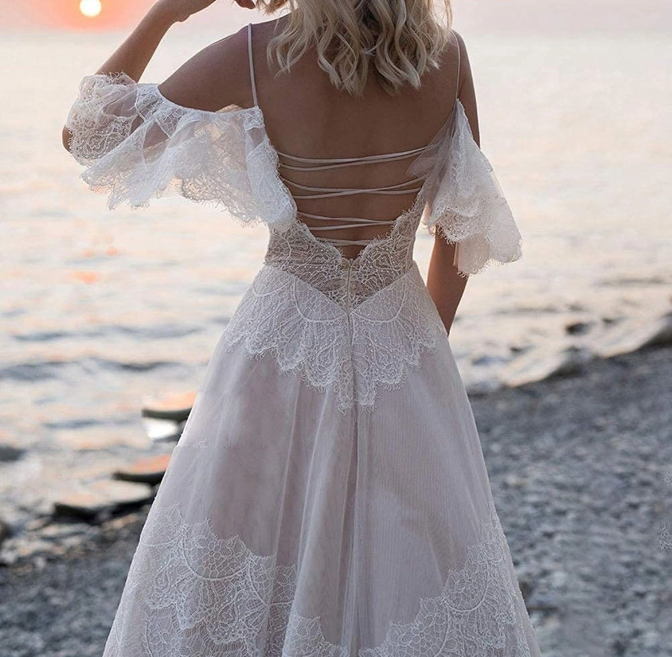 Bohemian wedding dress with lace appliques. Features a V-neck, A-line silhouette, and cap sleeves. The back has a corset closure with hooks & eyes and a zipper. The color is beige or ivory, and it has a train. Size M.