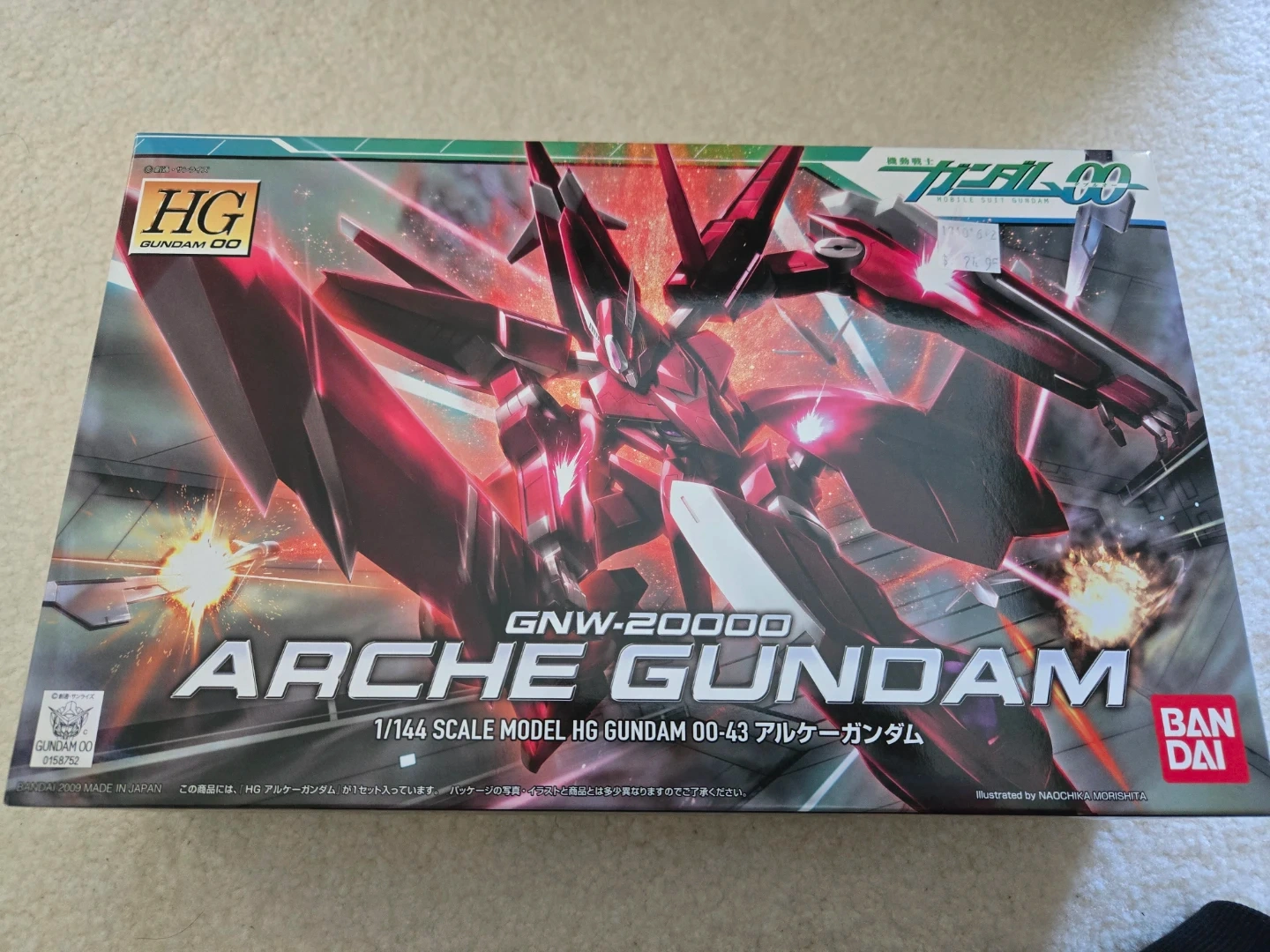 Bandai High Grade 1/144 scale model kit of the GNW-20000 Arche Gundam from Gundam 00. It was made in Japan by Bandai in 2009. This model kit is great for Gundam enthusiasts!