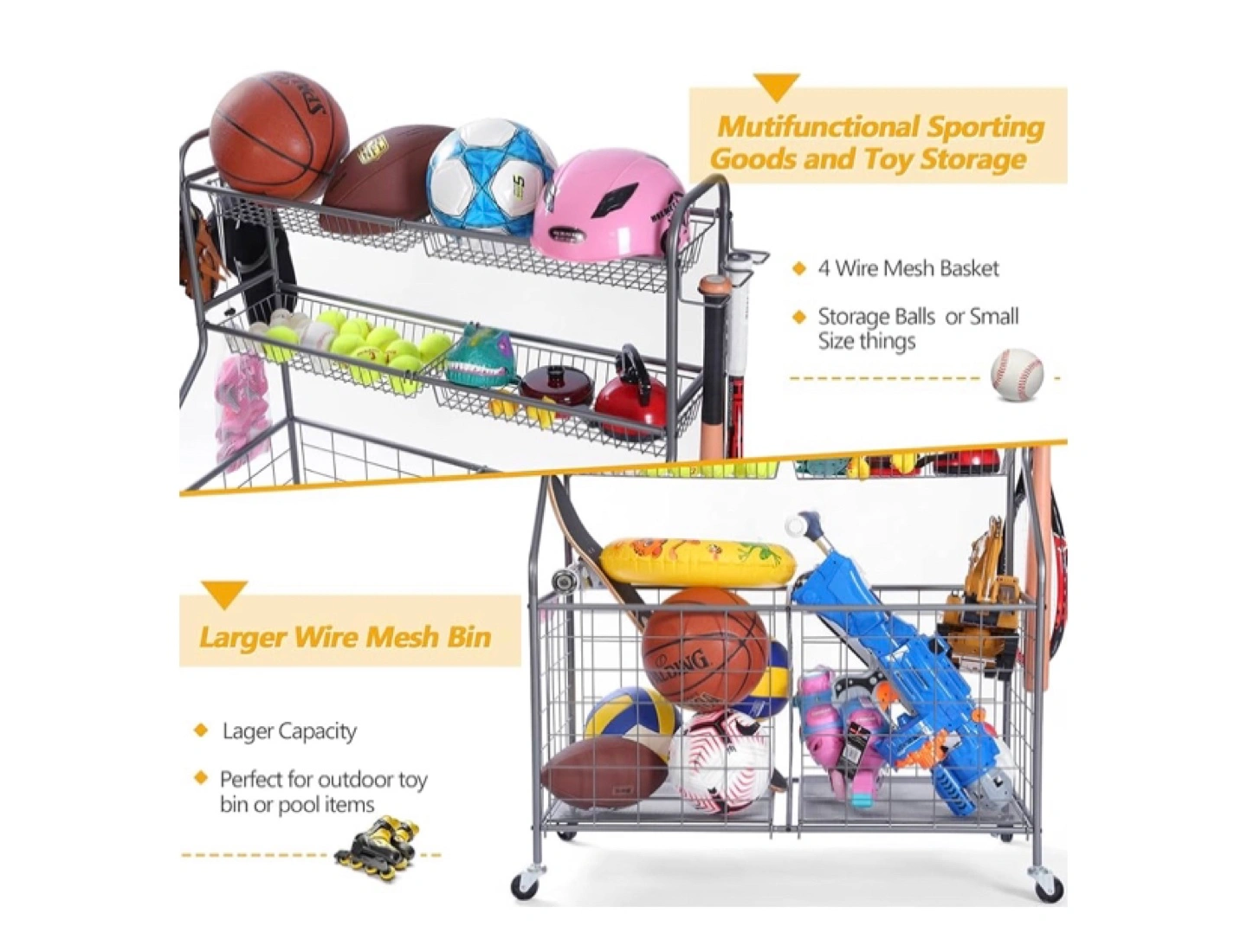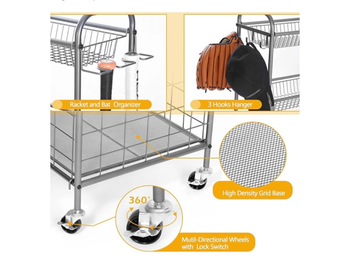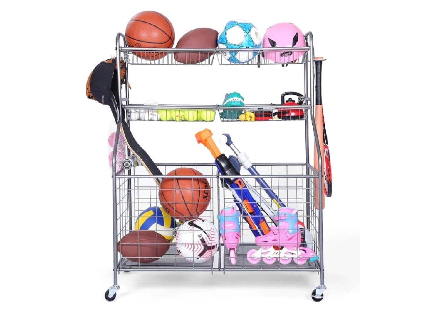 Get your garage, basement, or game room organized with this sports equipment storage solution! It features 4 wire mesh baskets and a larger wire mesh bin for all your sporting goods and toys. It also has a racket and bat organizer and 3 hooks for hanging your gear. The multi-directional wheels with lock switch make it easy to move around your space