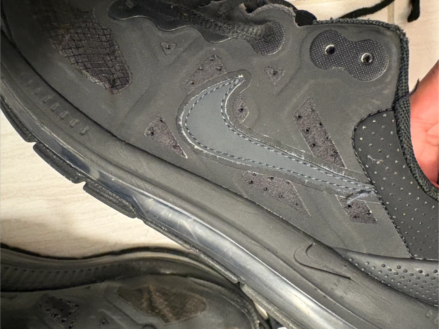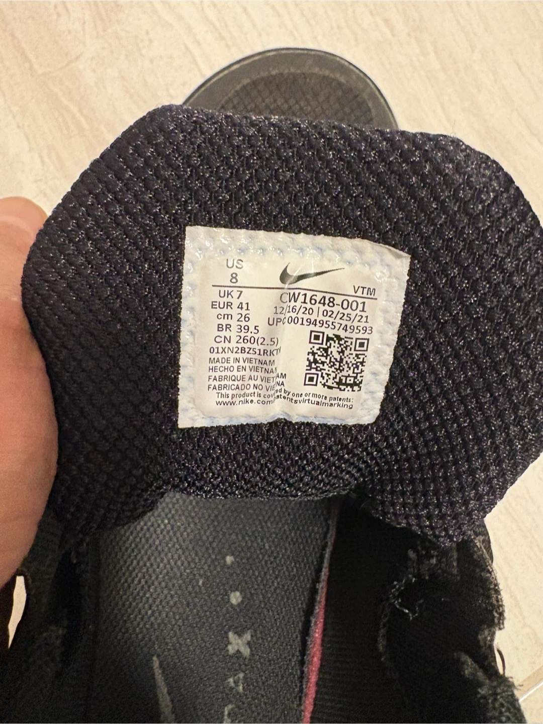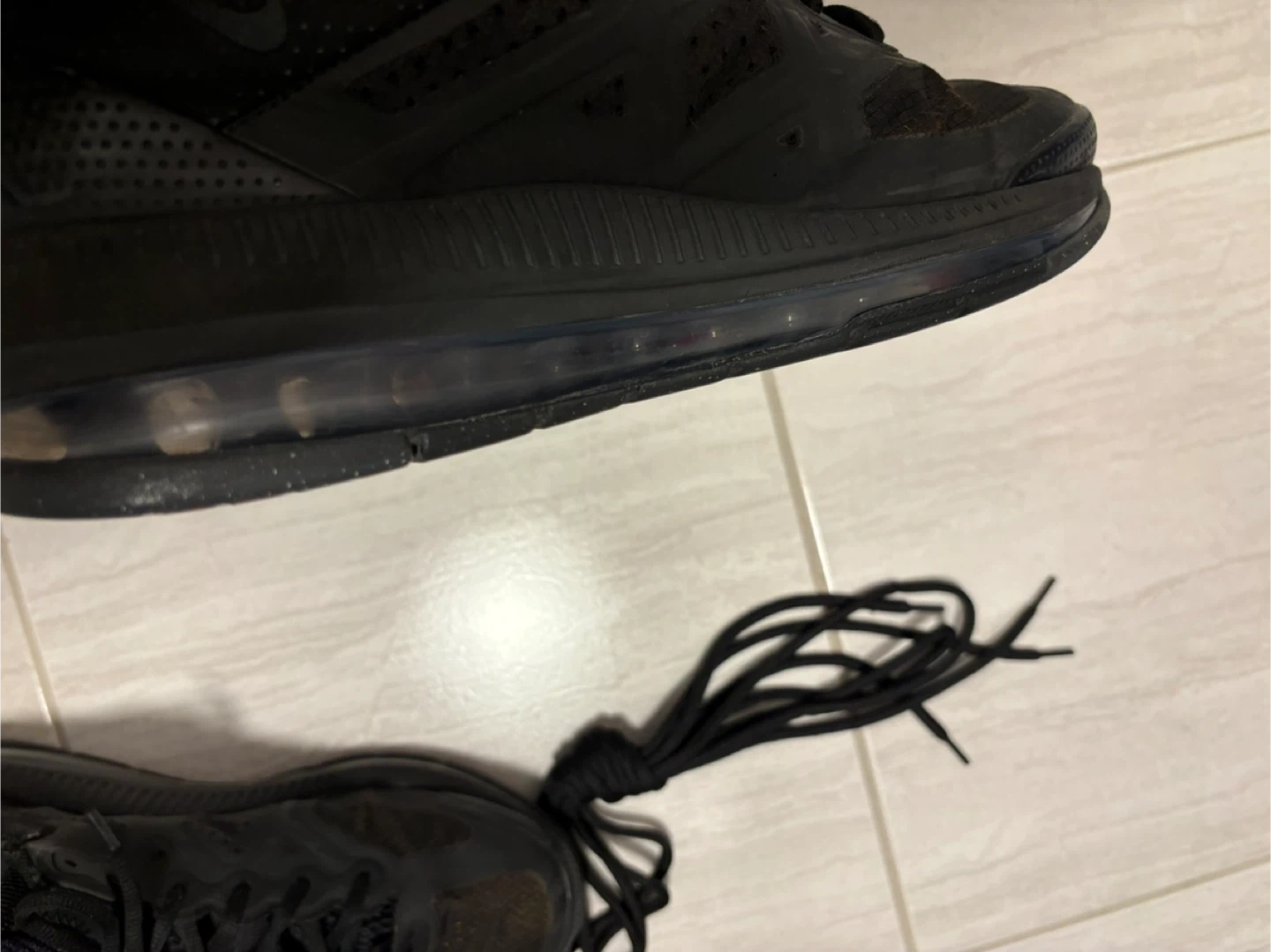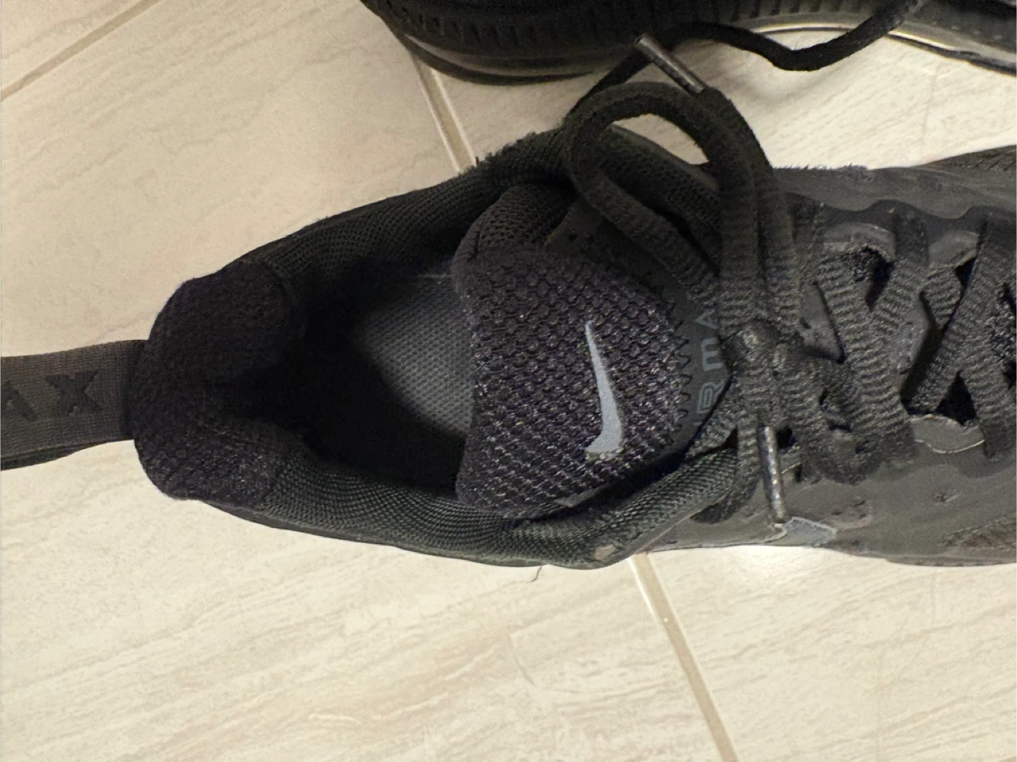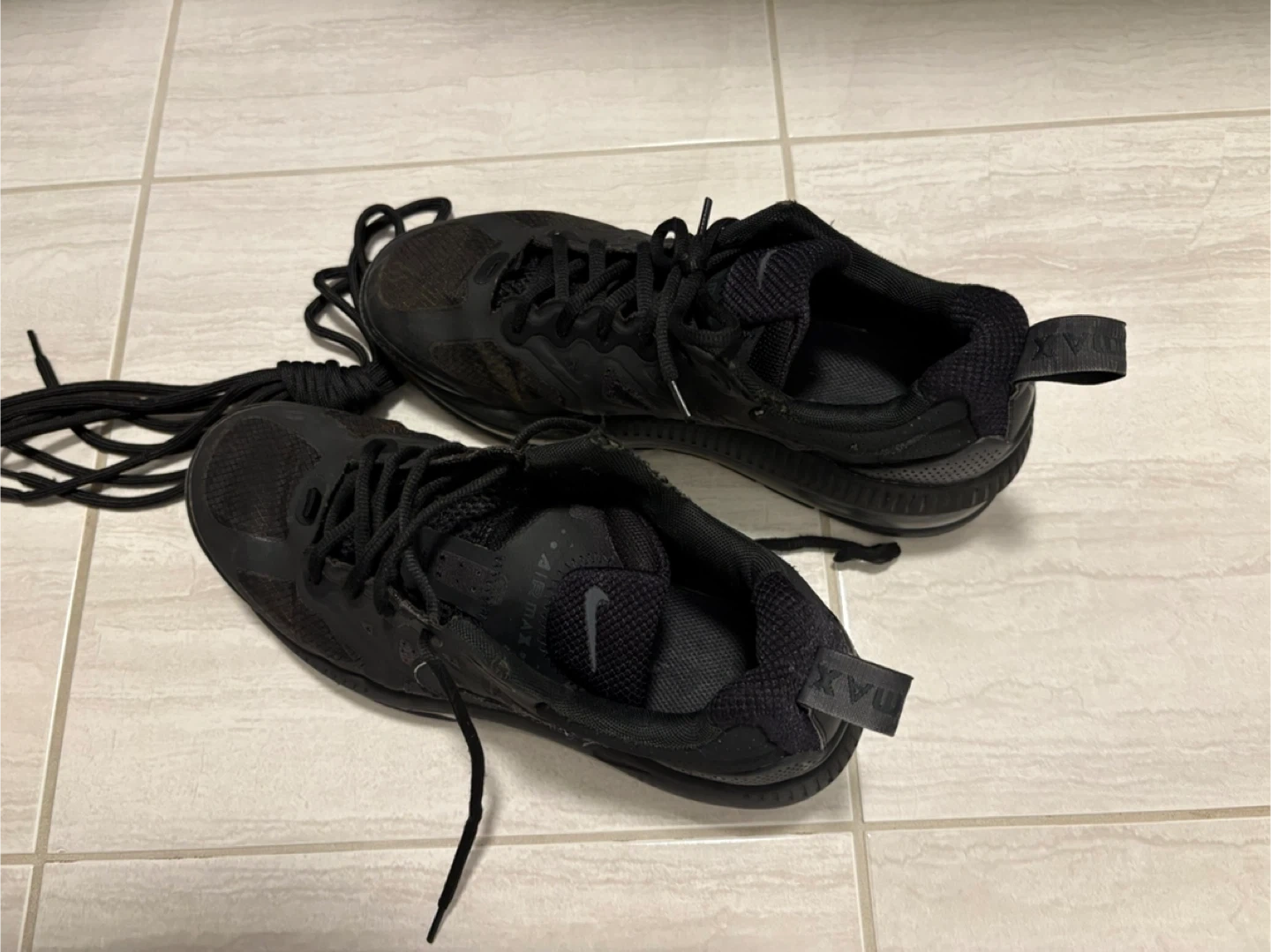 This black Nike Air Max running shoes is designed for comfort and performance. It features a durable construction with mesh uppers and a visible Air Max cushioning unit in the sole. Extra new pair of laces is included. Size 8 men.