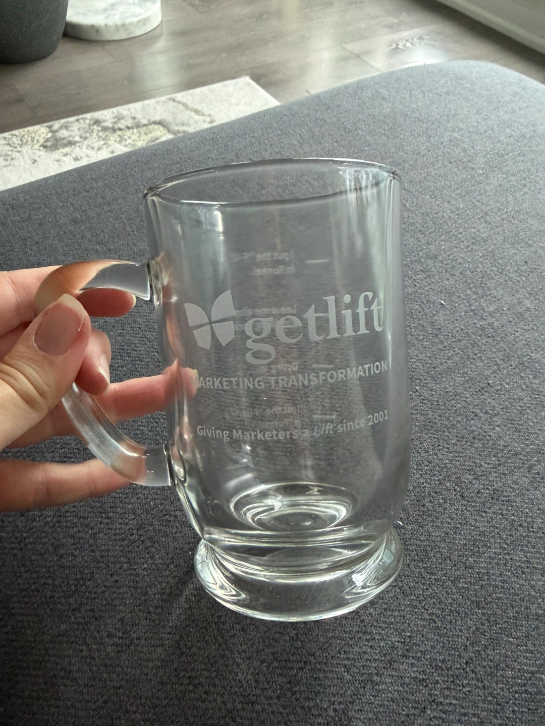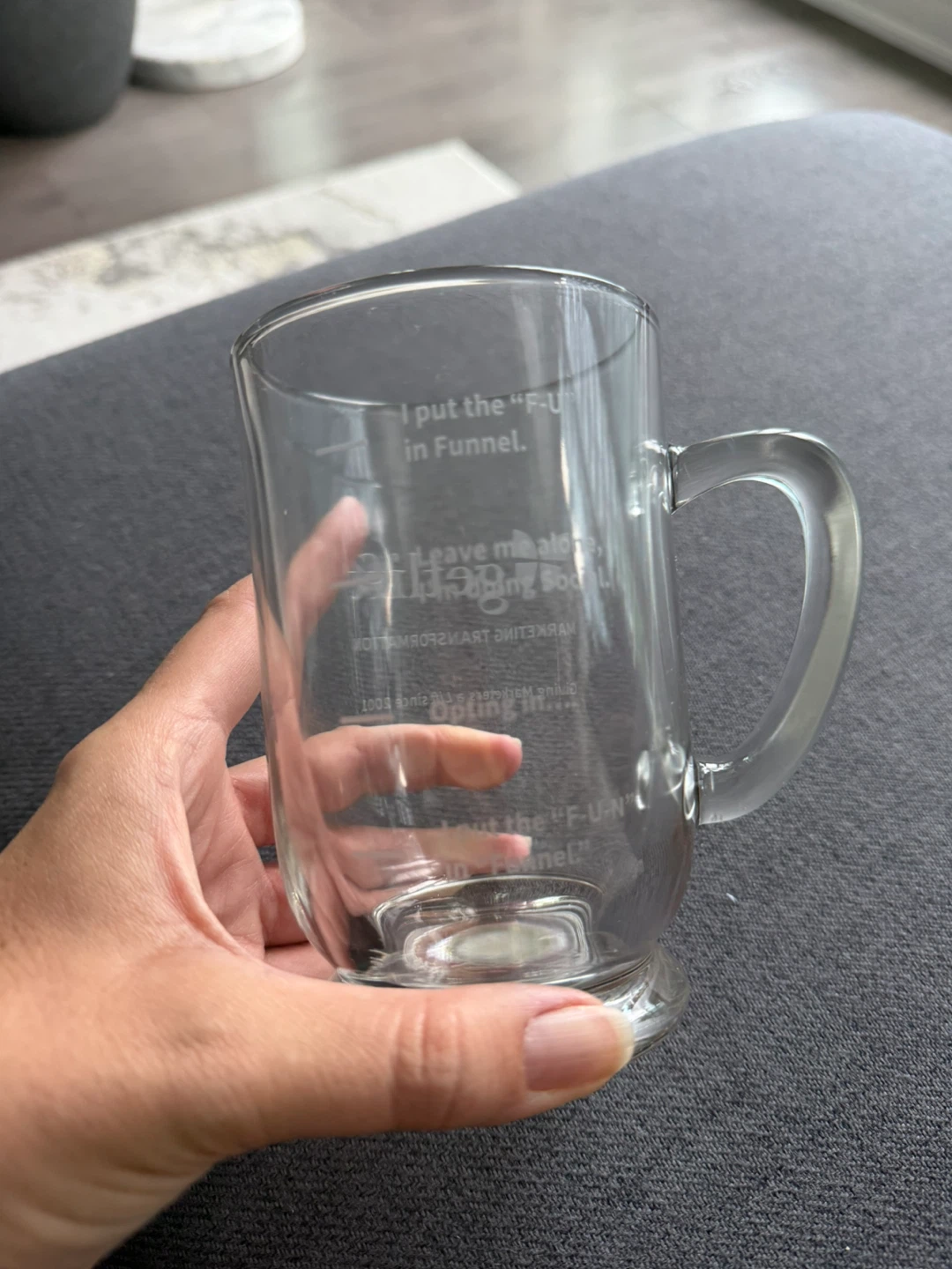 Selling a clear glass mug from Getlift Marketing Transformation! It has the phrase "I put the 'F-U-N' in Funnel" printed on it, along with the Getlift logo and the tagline "Giving Marketers a Lift since 2001"