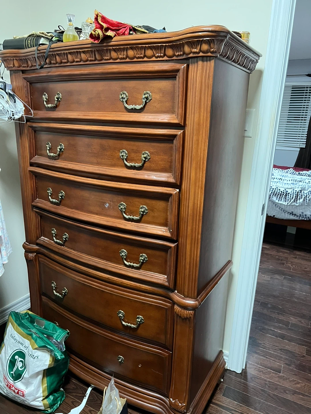 This tall dresser features six drawers for ample storage. It's made of wood with ornate brass-toned hardware. The top has decorative moulding.