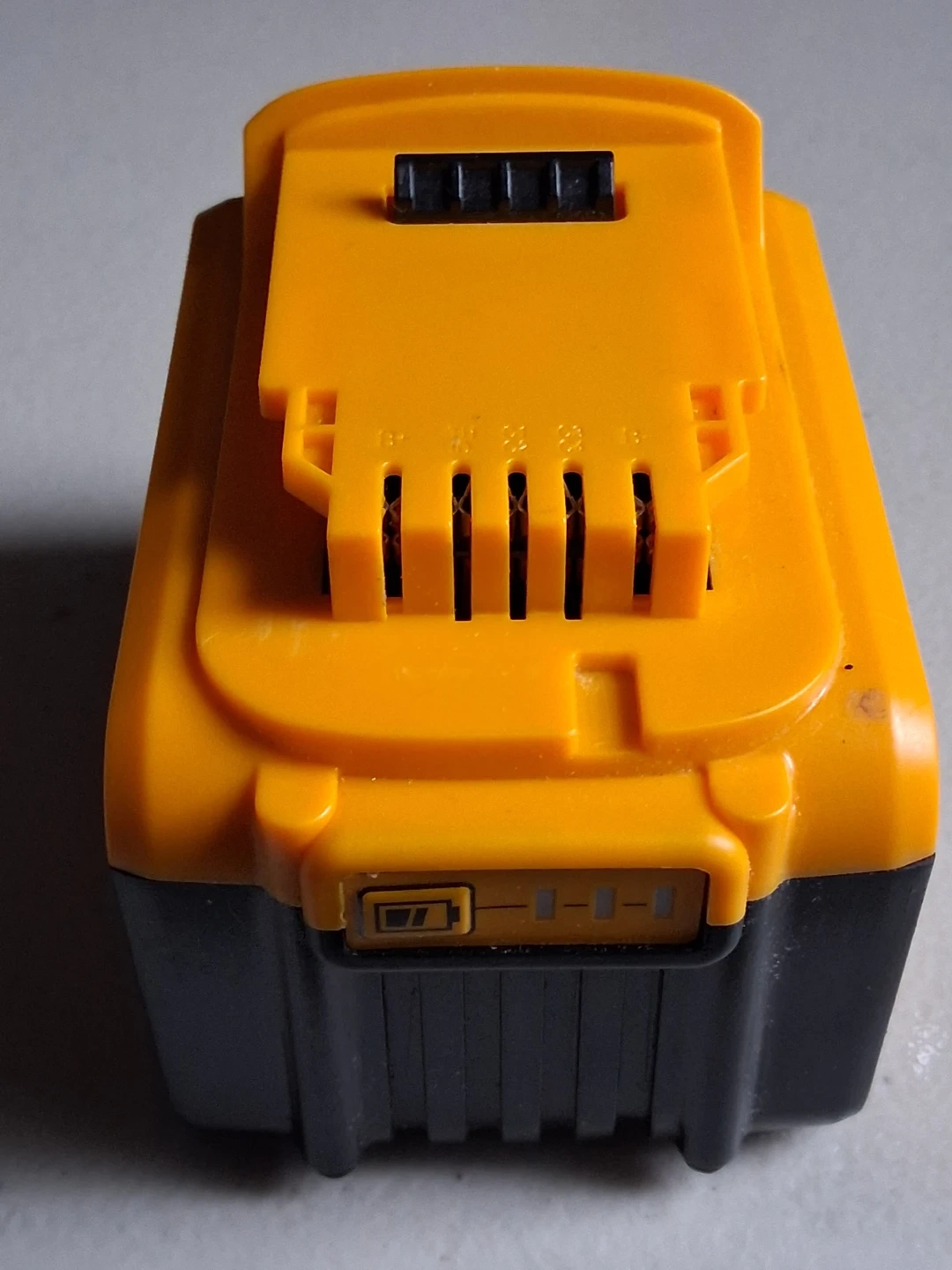 This is a DEWALT 20V MAX Lithium-Ion battery. It's the 12.0 Ah Extended Range model. It has a charge indicator. This battery provides longer run time for your DEWALT tools.