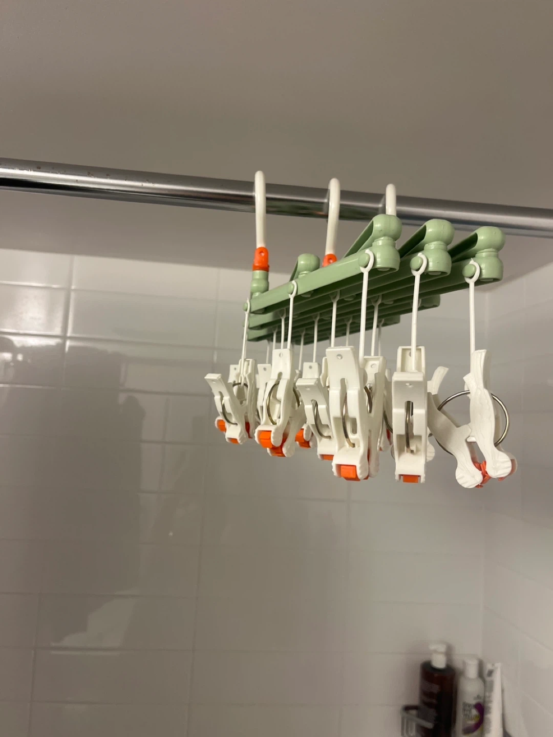 Here's a handy folding clothes drying rack! It comes with a bunch of clips to hold your clothes while they dry. Perfect for saving space and keeping your laundry organized