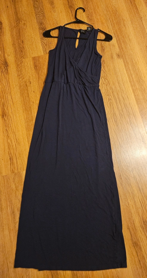 Please pick up due to no vehicle at the moment. A sleeveless, navy blue maxi dress. It features a keyhole detail at the neckline and a fitted waist. The fabric appears lightweight, perfect for warm days. I'm sure you'll find this dress to be the ultimate outfit for your next vacation, if you are looking to relax.