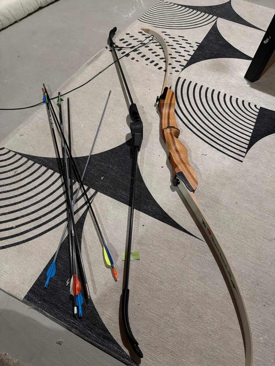 This is a set including a traditional wooden recurve bow and several arrows. The bow has a light-coloured wood riser and a dark limb. It comes with a variety of arrows with different fletching colours, including blue, red, and yellow. Perfect for beginner archers!
