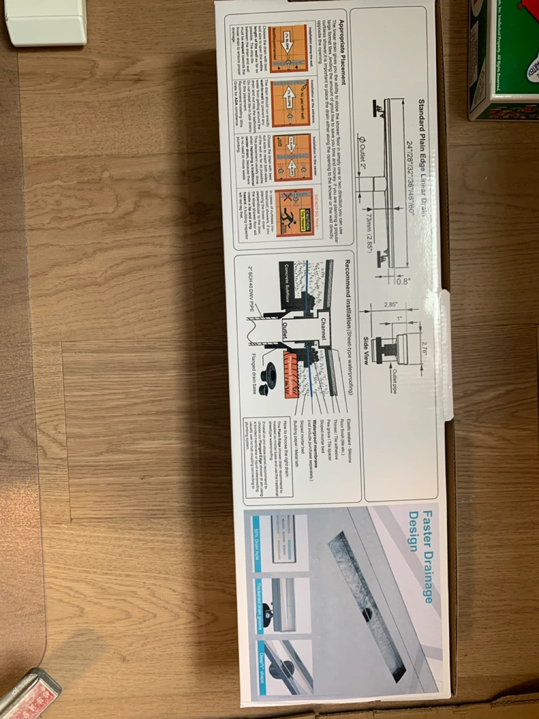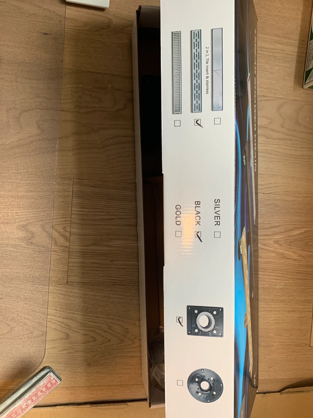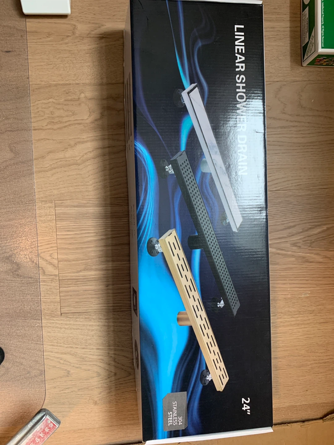 This is a linear shower drain, 24 inches in length. It features a stainless steel construction for durability. The kit includes the drain body and a square base for installation.