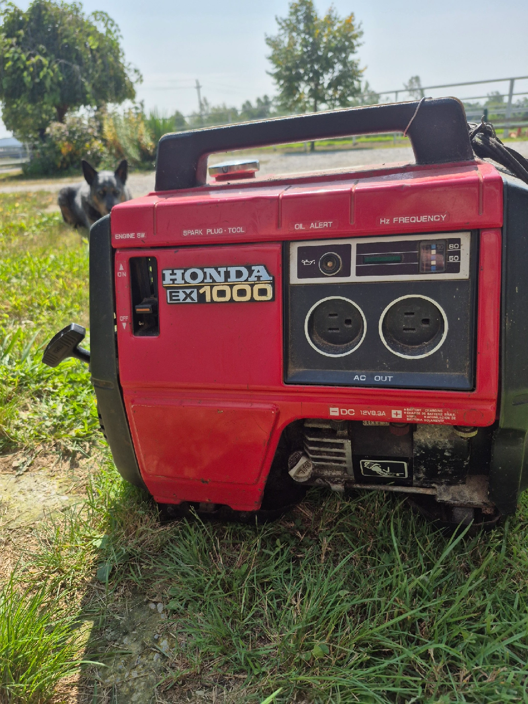 Selling a Honda EX1000 generator. It's red and has AC and DC outputs. It also features an oil alert and a frequency indicator. Good for outdoor use or emergencies