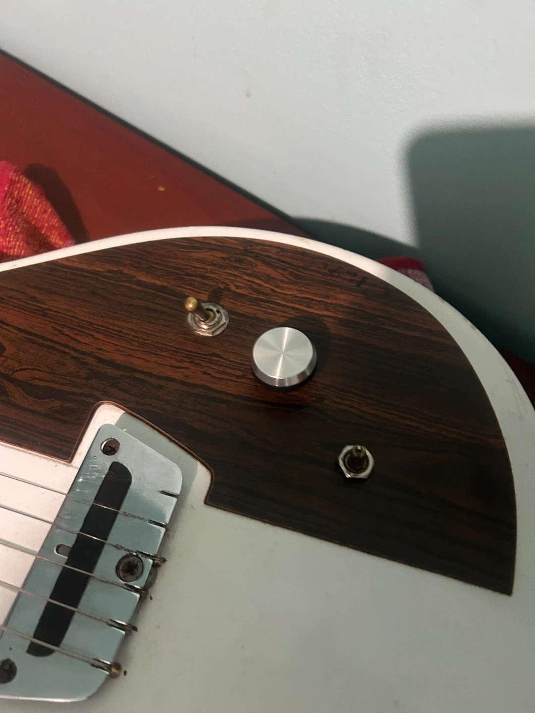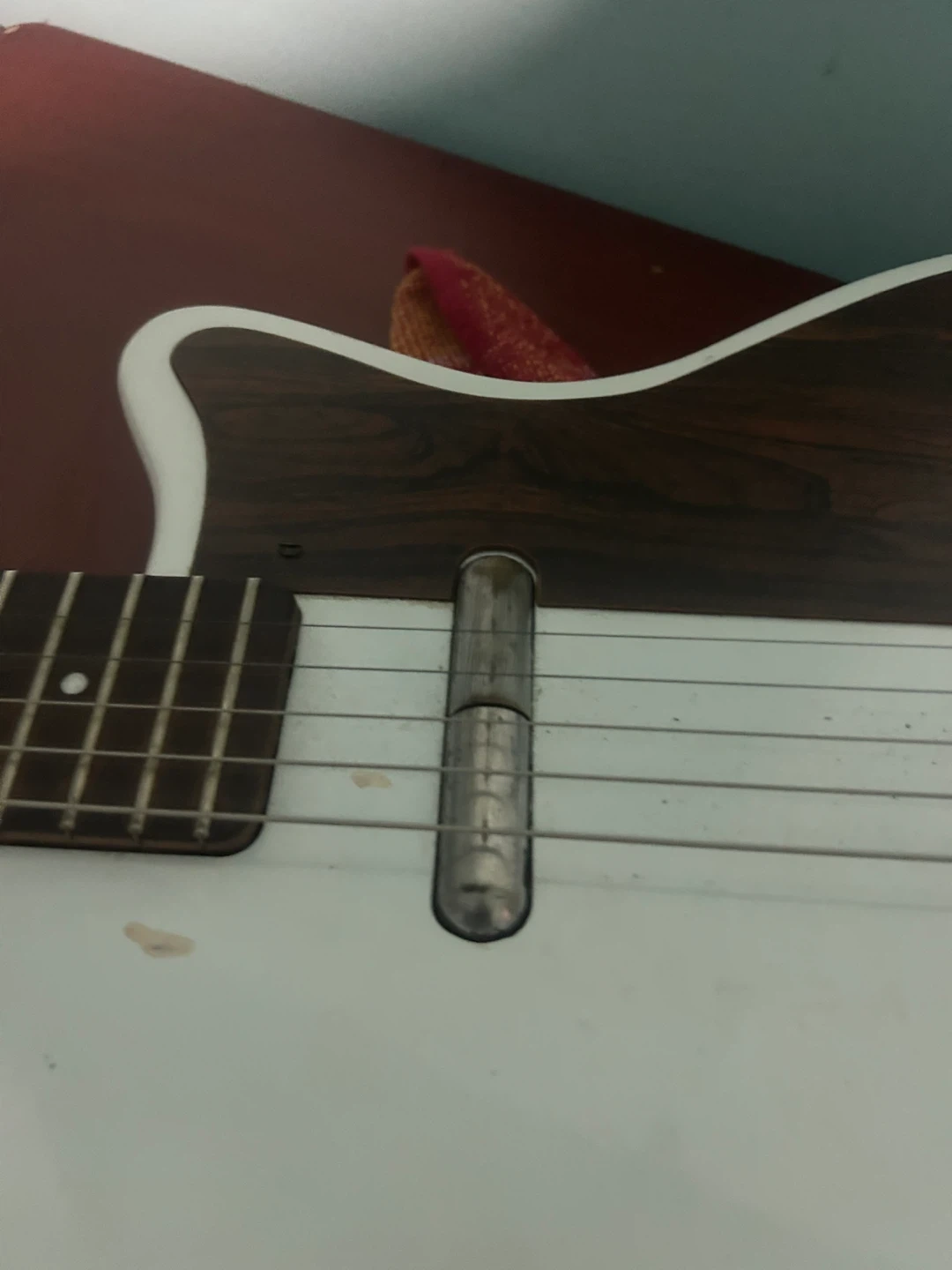 White and wood-grain electric guitar. this guitar has no branding it needs a little work but it can be an amazing guitar with the right kind of work