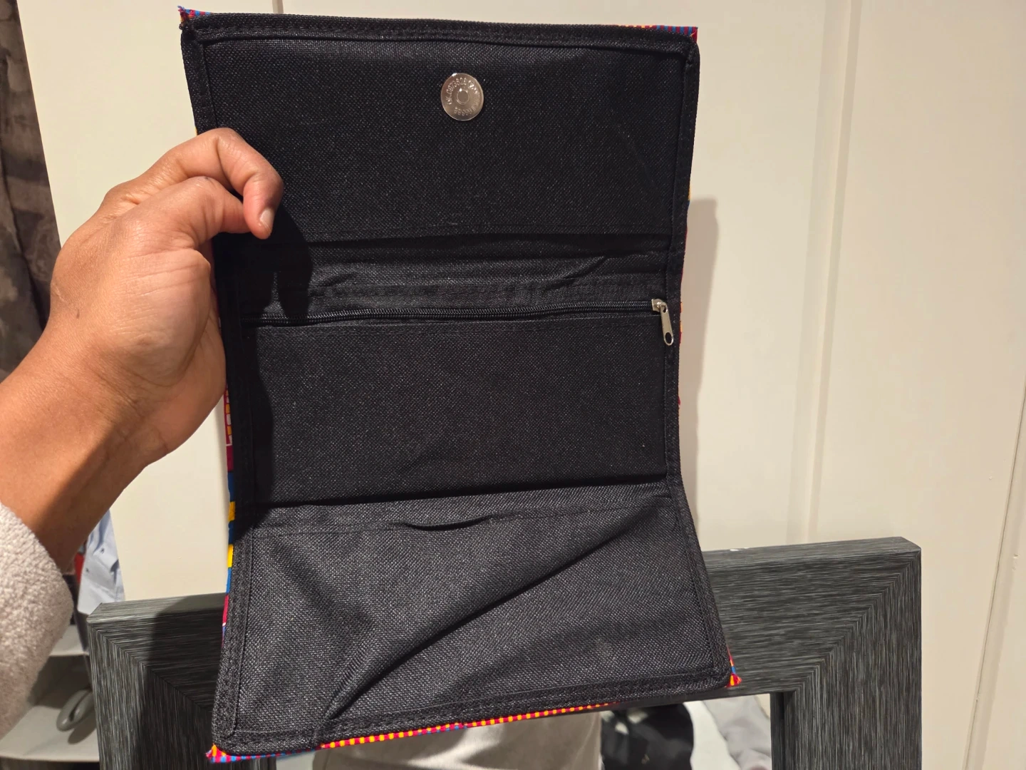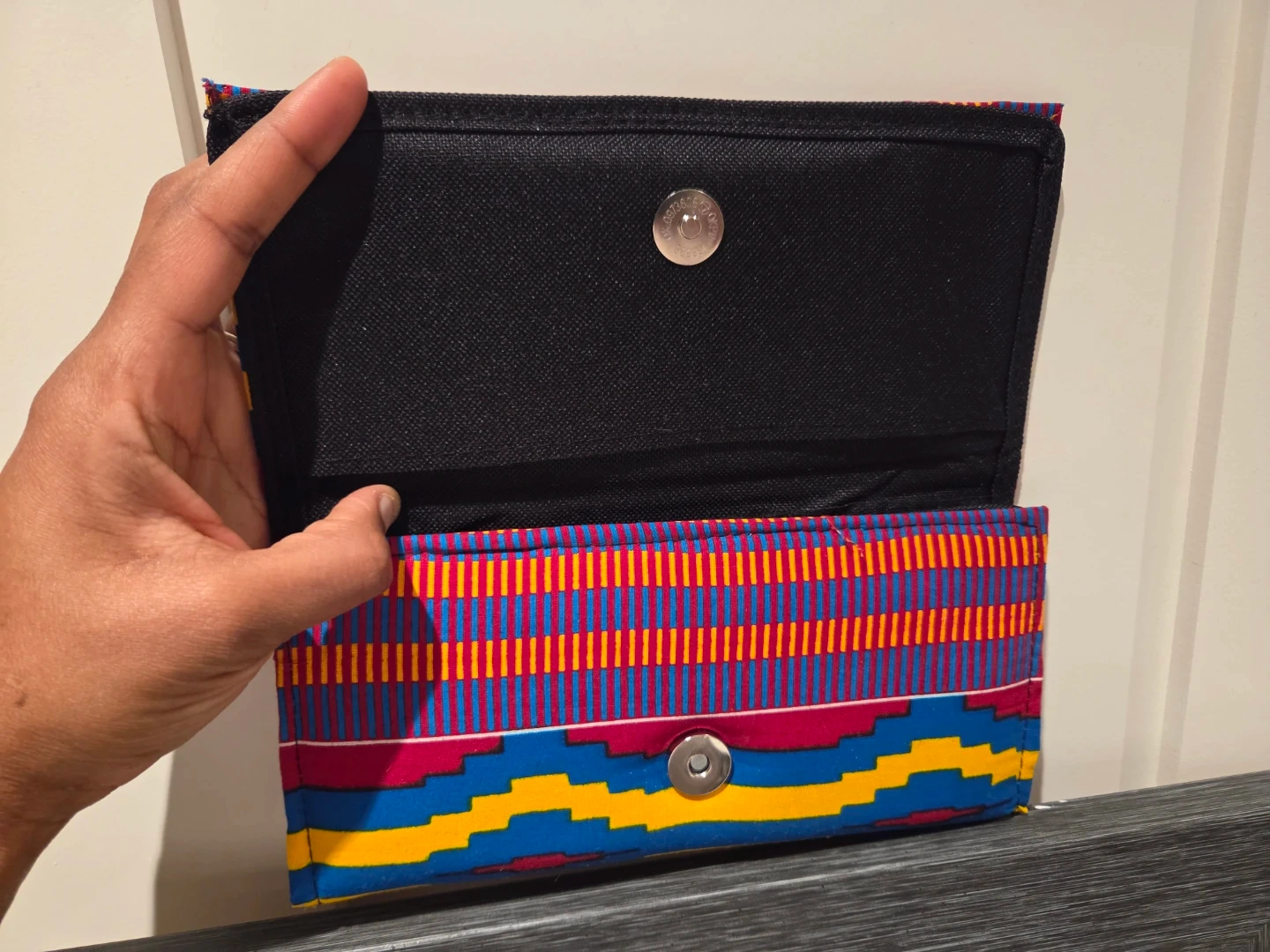 This vibrant wallet features a traditional Kente cloth pattern in bold blues, yellows, and reds. It has a secure snap closure and multiple interior compartments, including a zippered pocket. The fabric construction makes it a stylish accessory for everyday use.