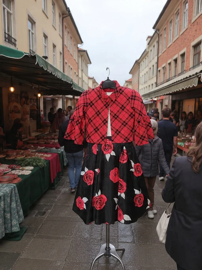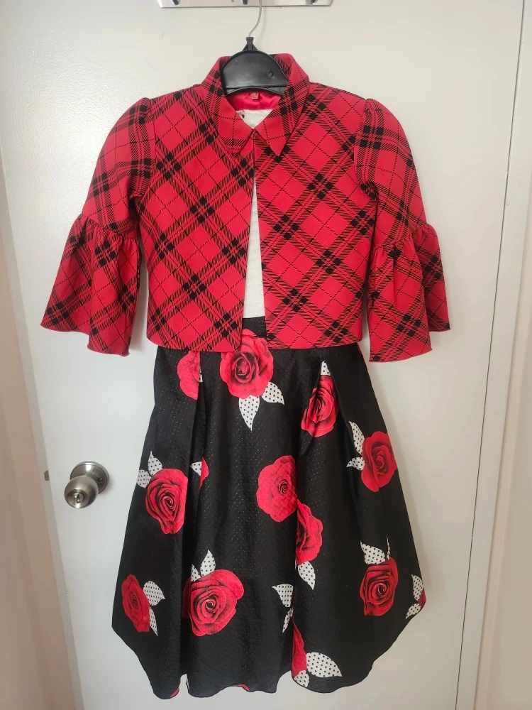 Plaid jacket paired with a black-and-white dress featuring big red roses and dotted white leaves