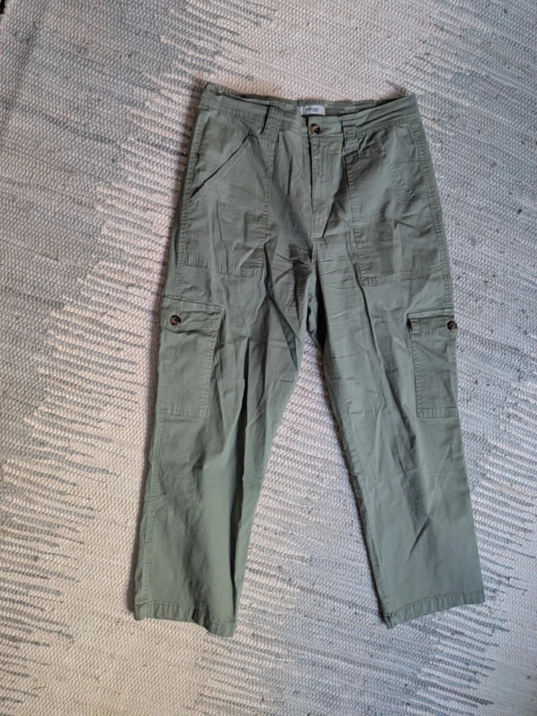 Kensie Jeans cargo pants in a light green colour. These are The Ella style, high rise and straight leg. Cotton blend with 2% Spandex for comfort. Size 10/30. Gently worn
